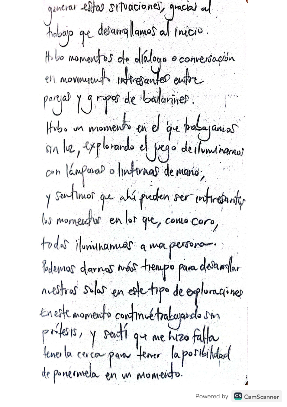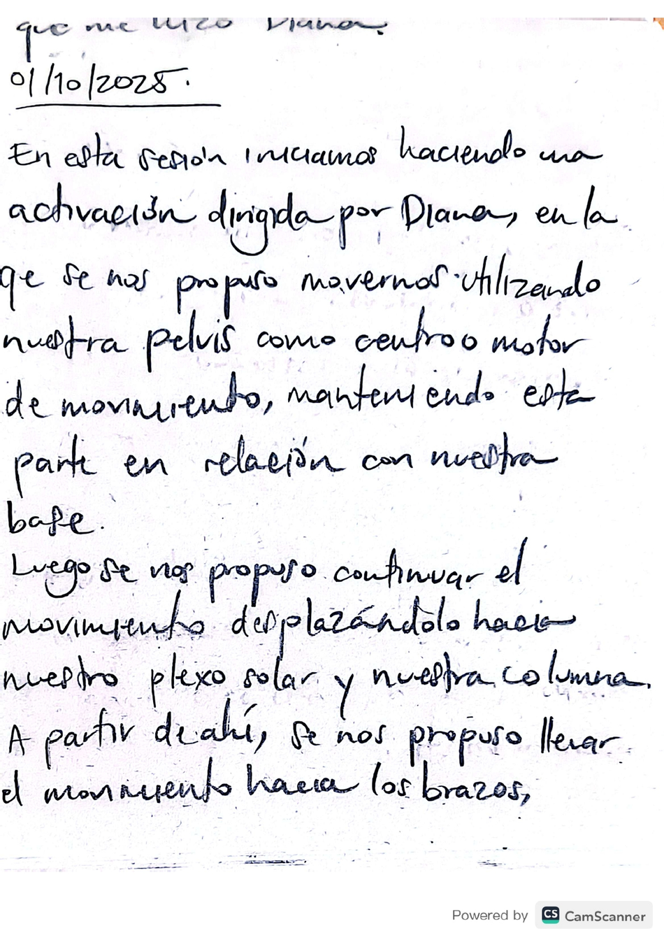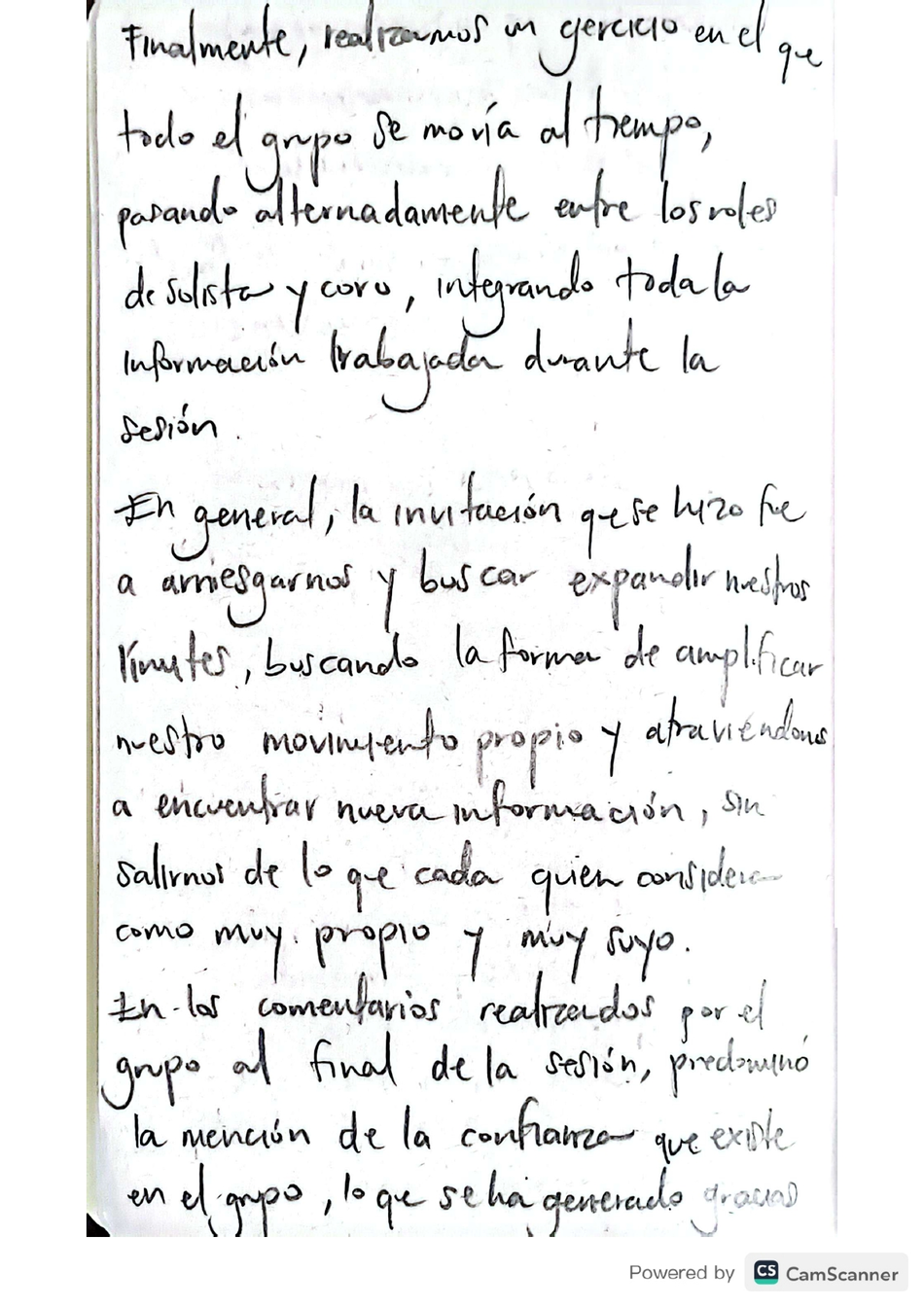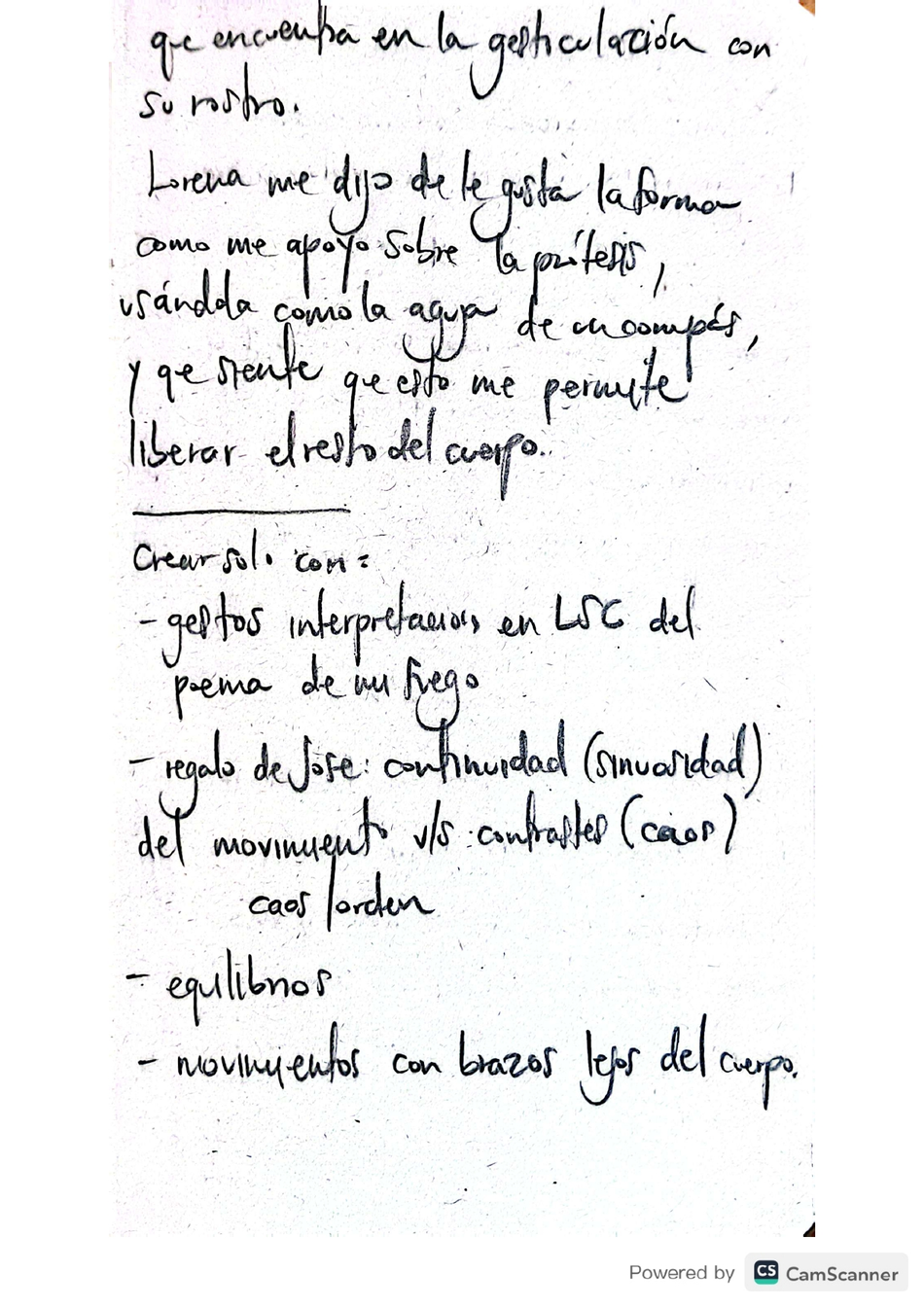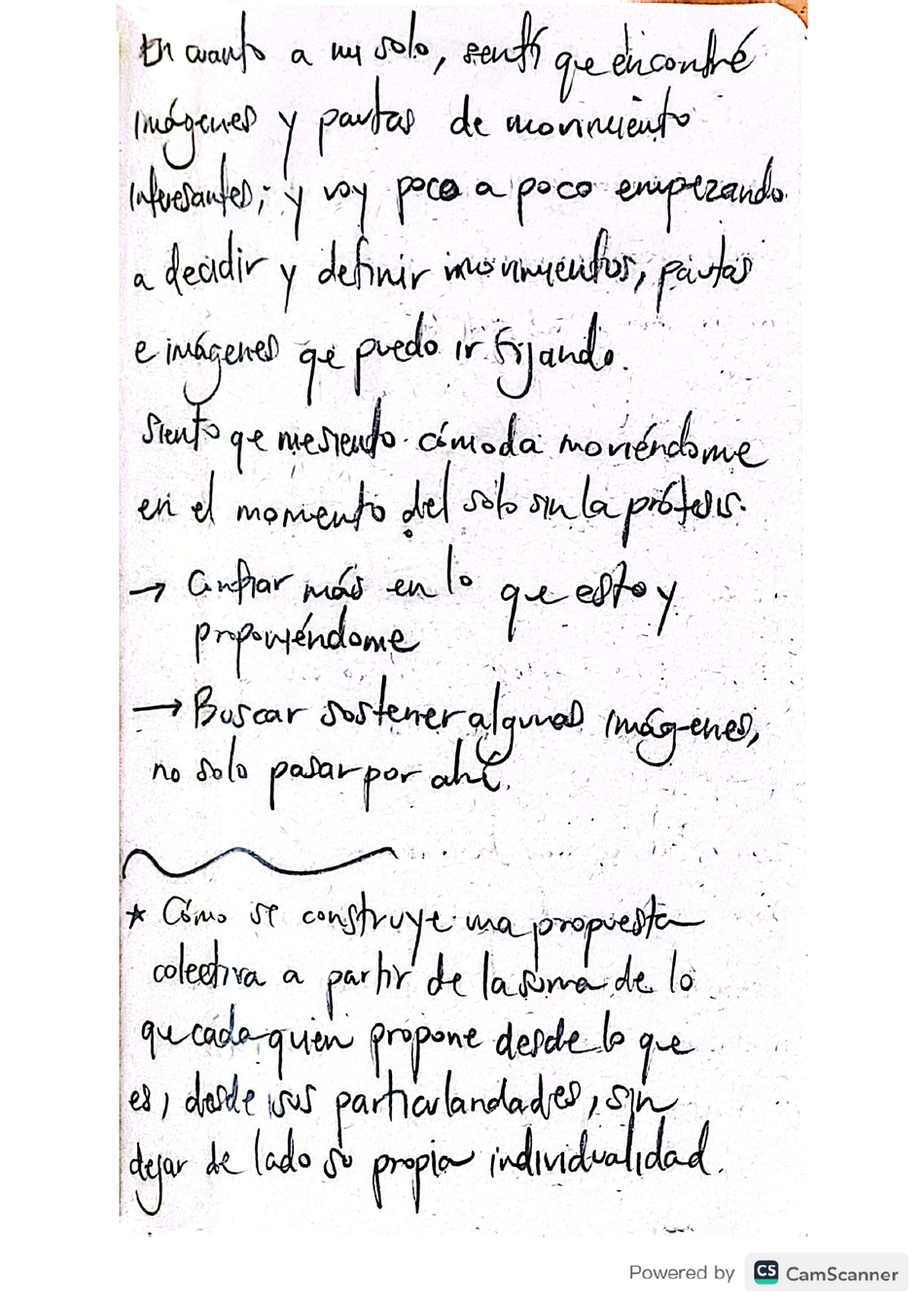 Hoy trabajamos en una primera versión de nuestros solos. Al respecto, siento que me cuesta fijar los movimientos, pues en las exploraciones siento que salen cosas interesantes en lo que hago, pero luego no sé cómo volver a encontrar ese movimiento y me cuesta componer una secuencia definida de movimiento, que pueda luego volver a ejecutar.