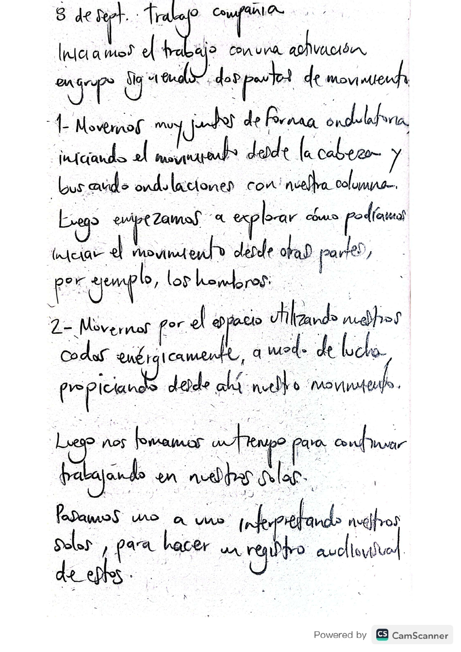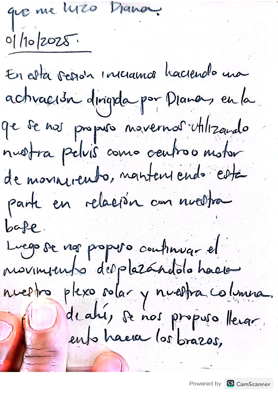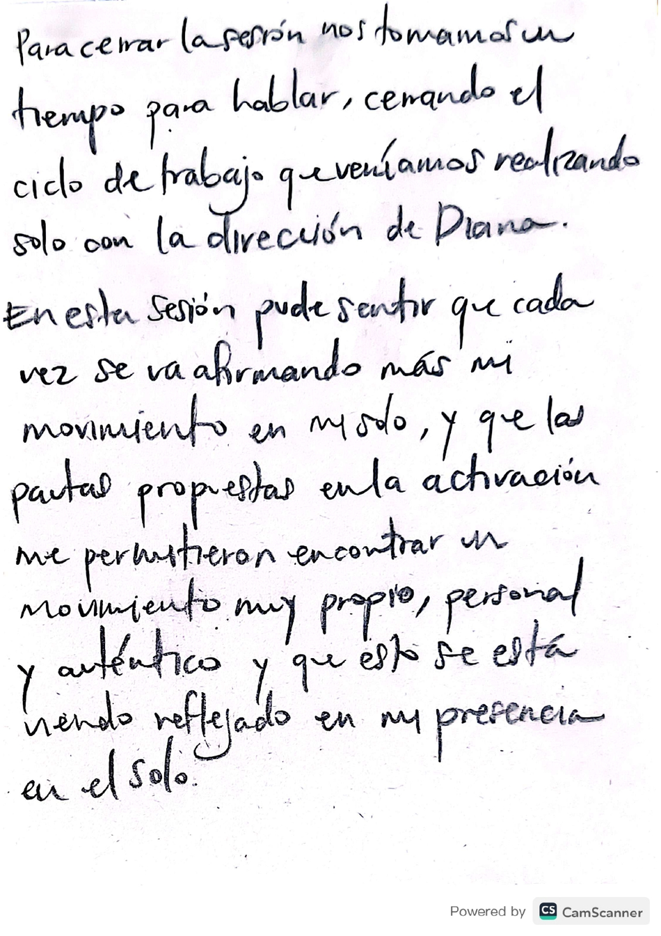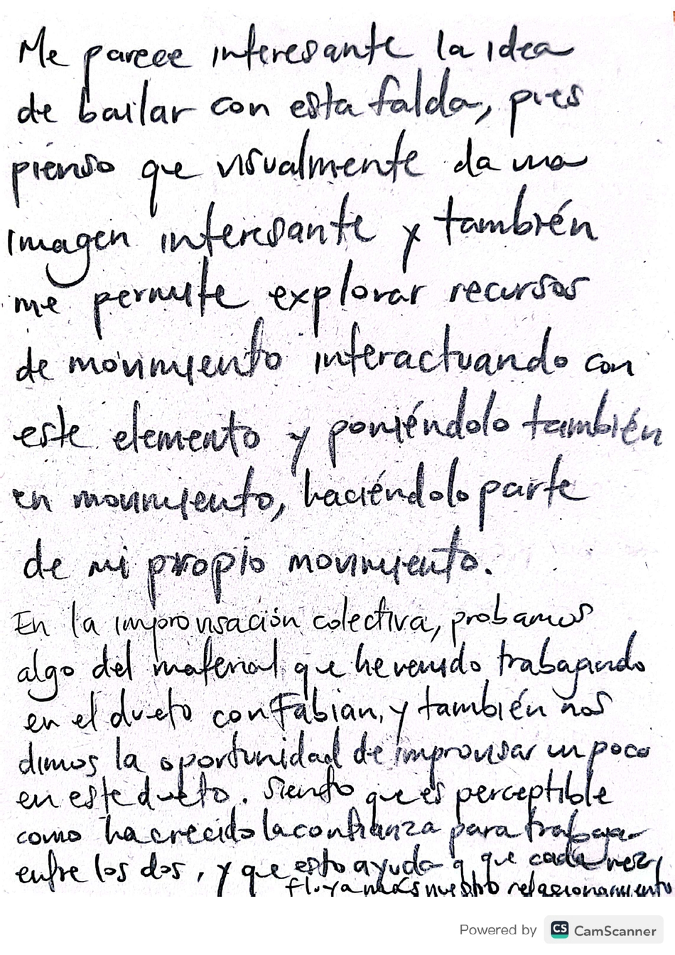 Hoy trabajamos en una primera versión de nuestros solos. Al respecto, siento que me cuesta fijar los movimientos, pues en las exploraciones siento que salen cosas interesantes en lo que hago, pero luego no sé cómo volver a encontrar ese movimiento y me cuesta componer una secuencia definida de movimiento, que pueda luego volver a ejecutar.