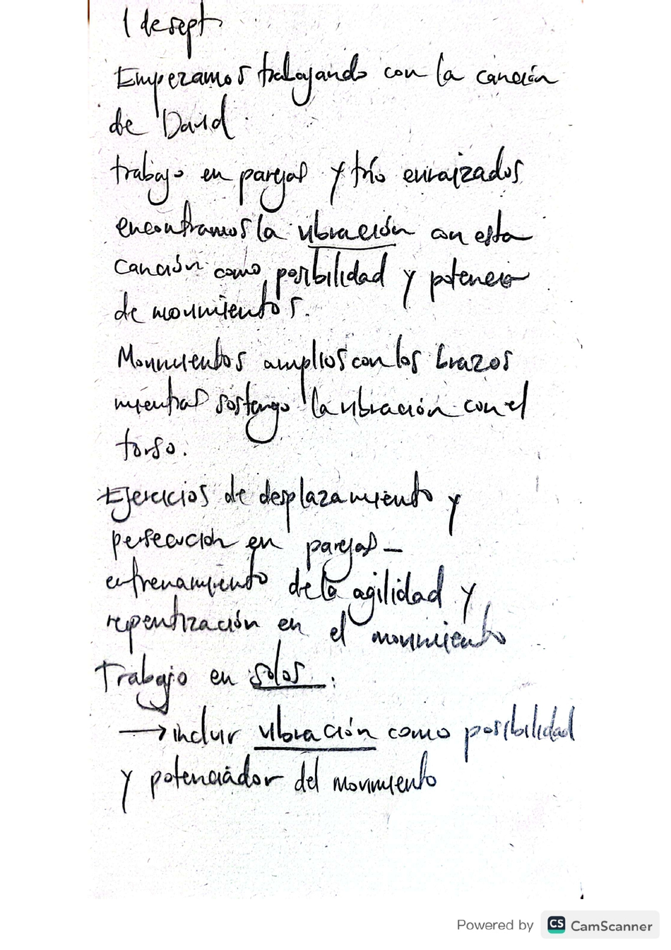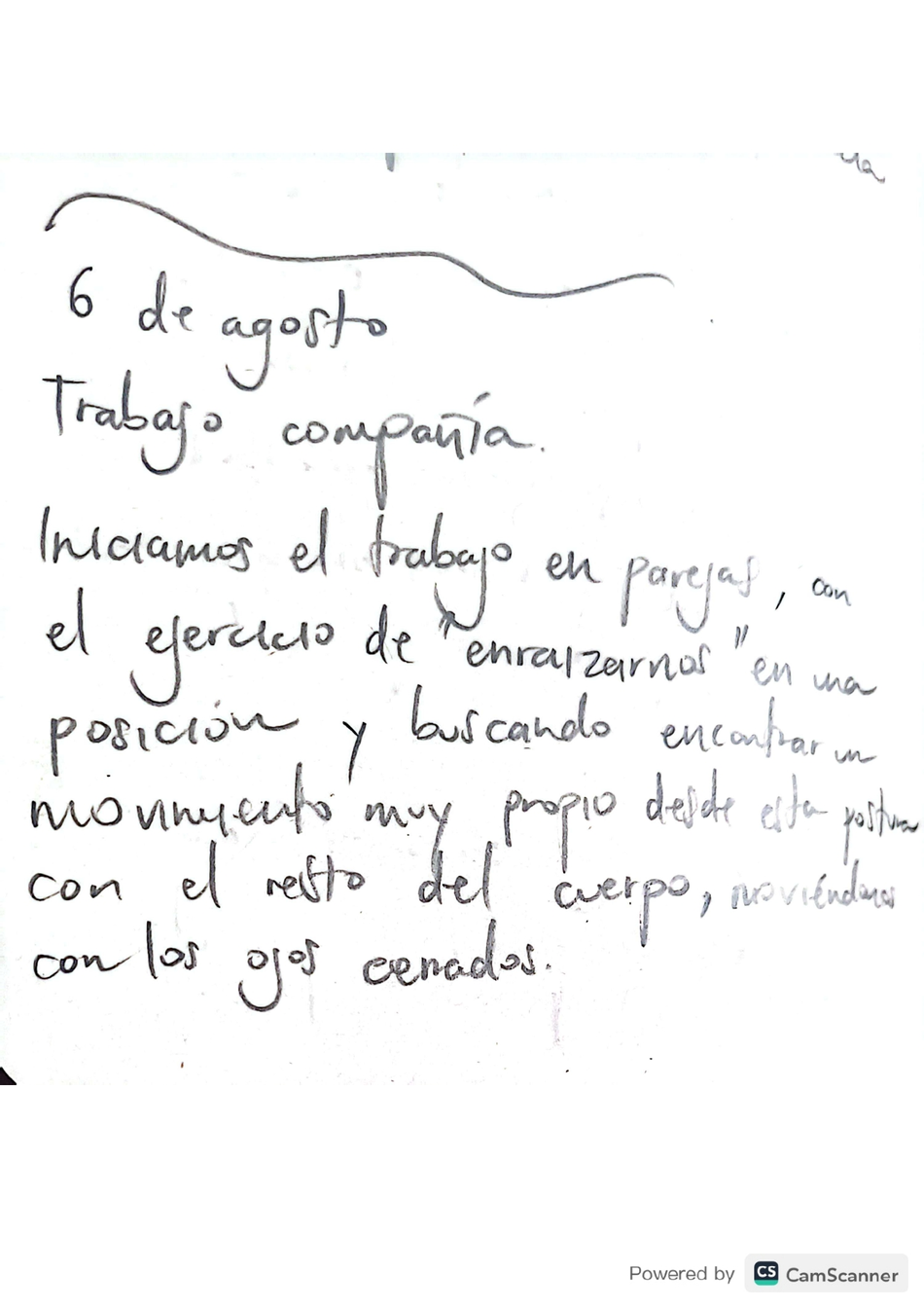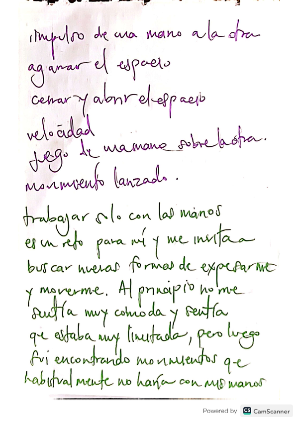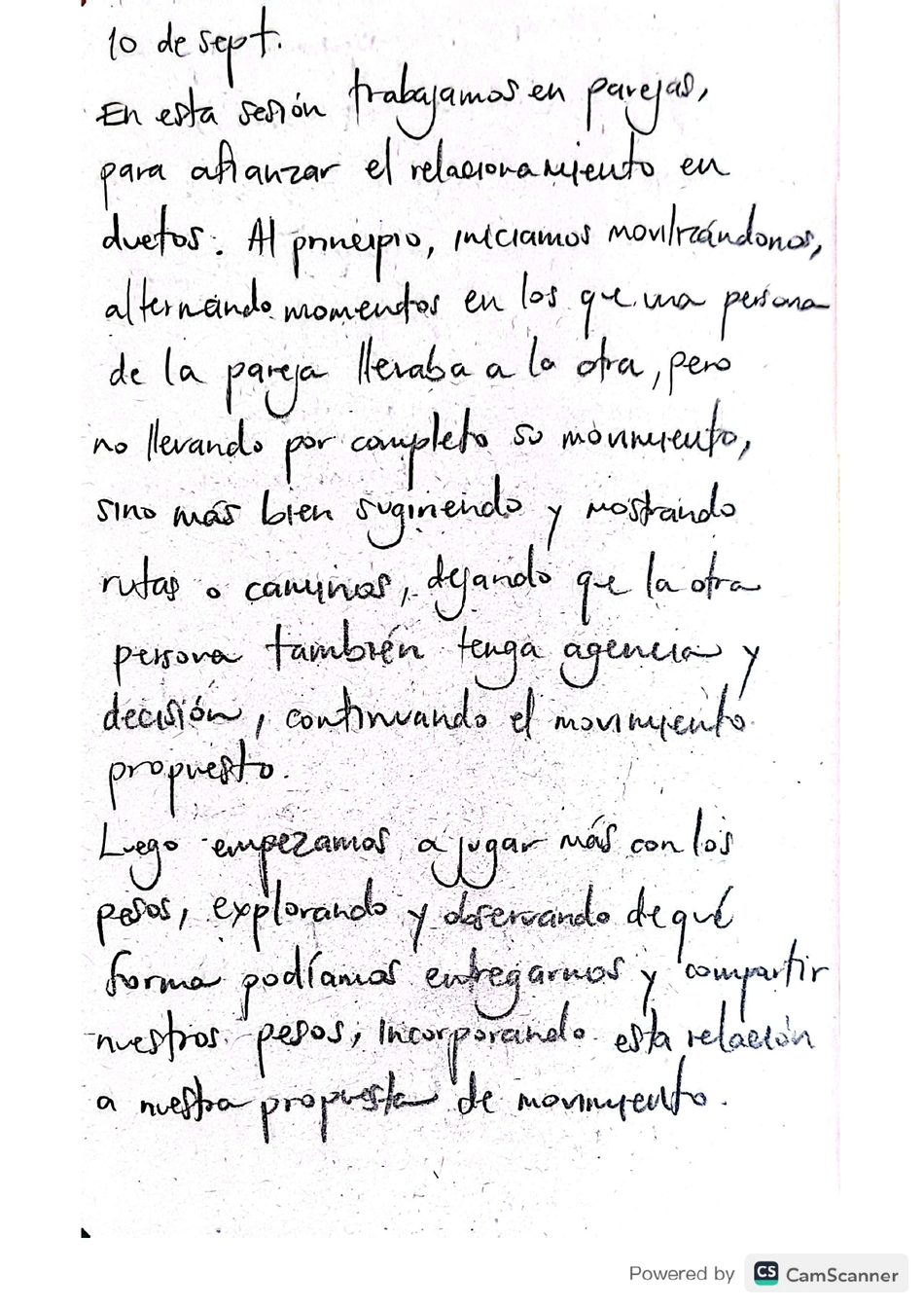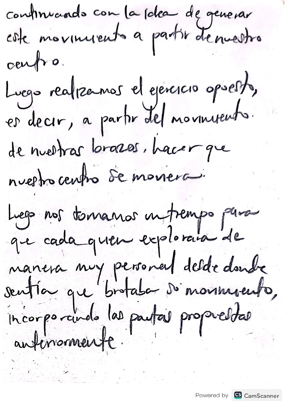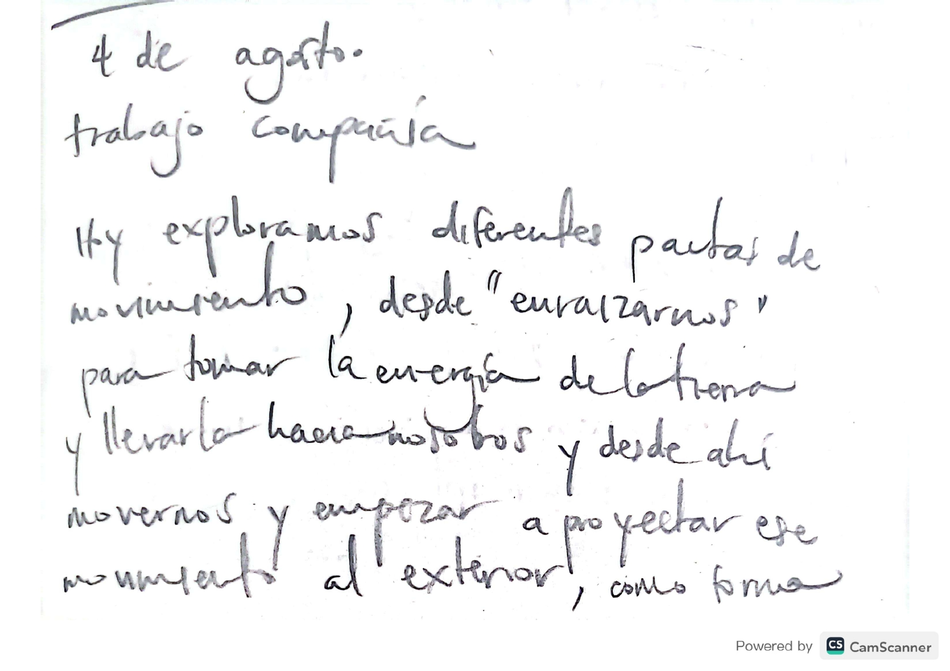 Hoy trabajamos en una primera versión de nuestros solos. Al respecto, siento que me cuesta fijar los movimientos, pues en las exploraciones siento que salen cosas interesantes en lo que hago, pero luego no sé cómo volver a encontrar ese movimiento y me cuesta componer una secuencia definida de movimiento, que pueda luego volver a ejecutar.