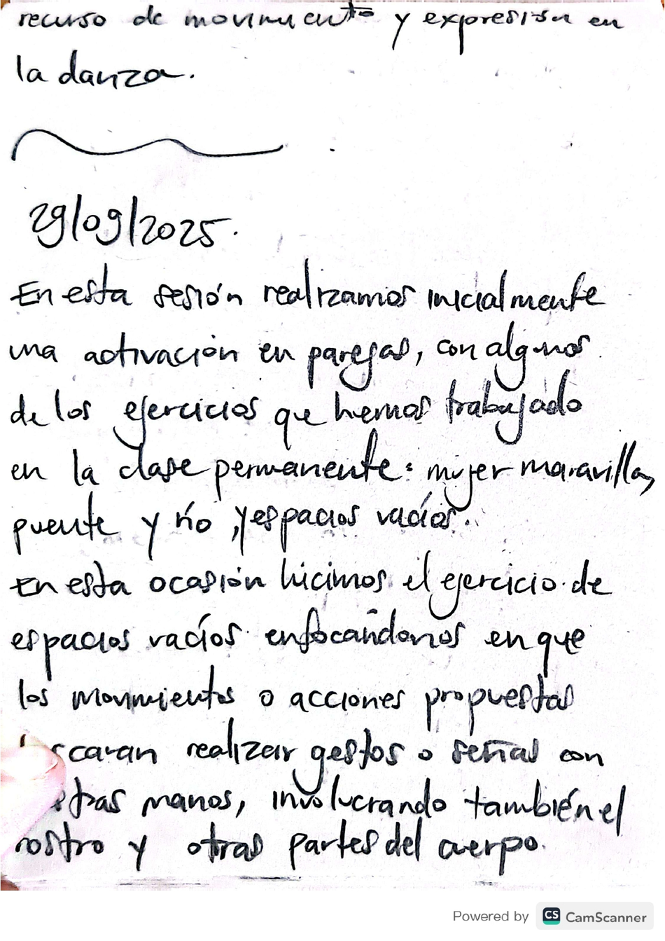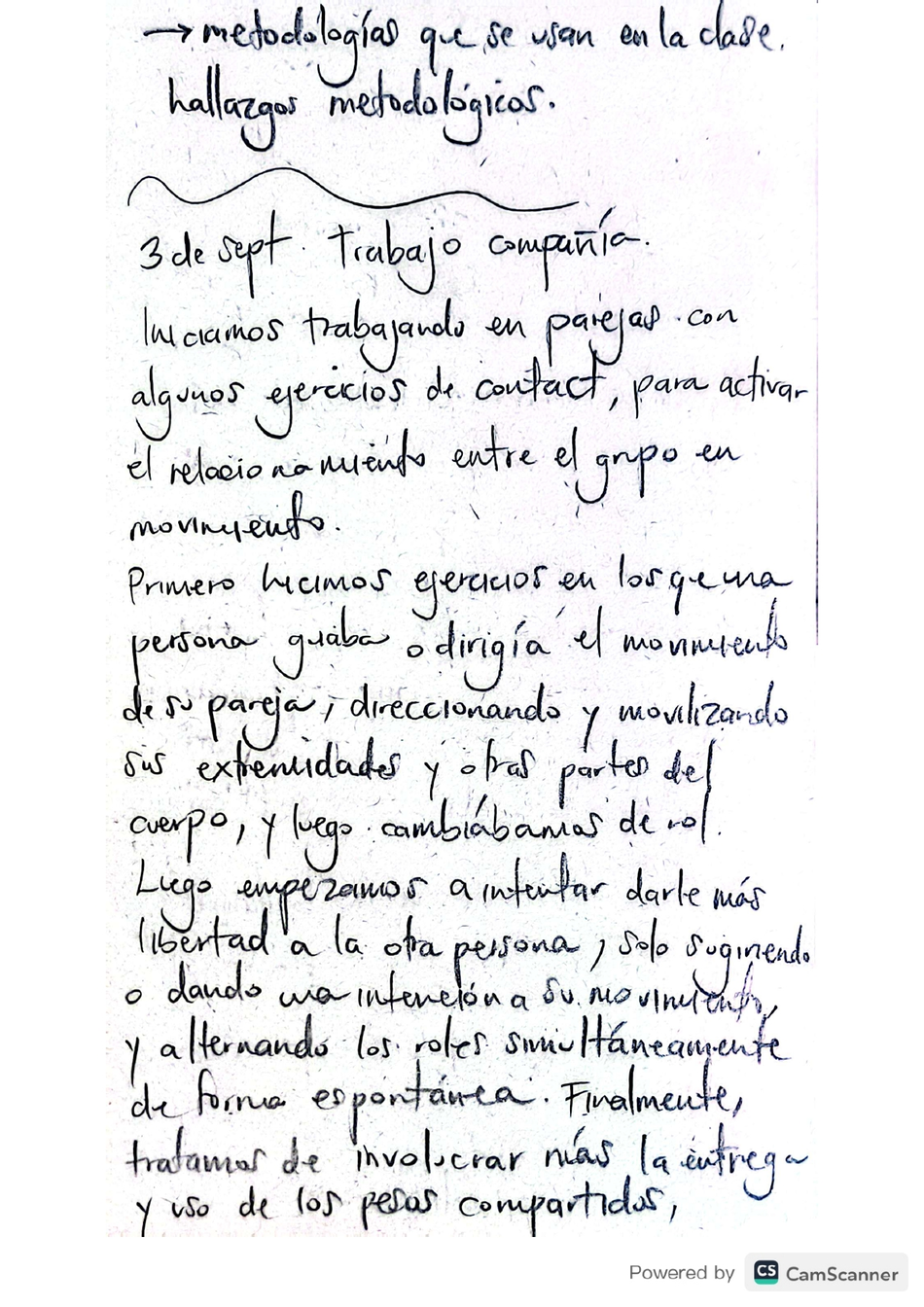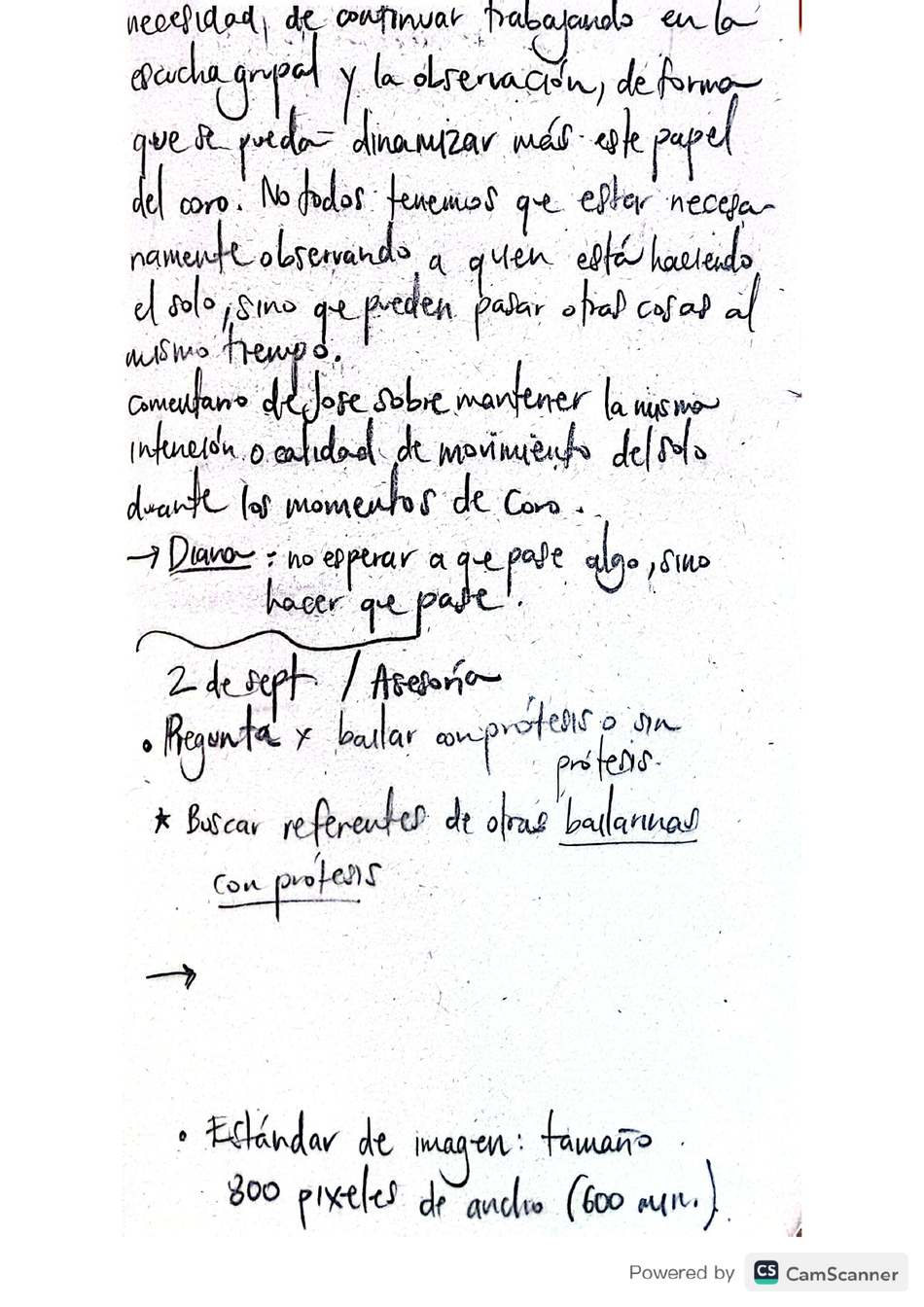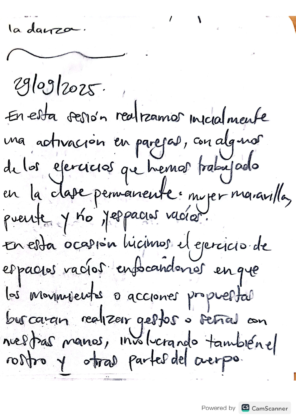 Hoy trabajamos en una primera versión de nuestros solos. Al respecto, siento que me cuesta fijar los movimientos, pues en las exploraciones siento que salen cosas interesantes en lo que hago, pero luego no sé cómo volver a encontrar ese movimiento y me cuesta componer una secuencia definida de movimiento, que pueda luego volver a ejecutar.