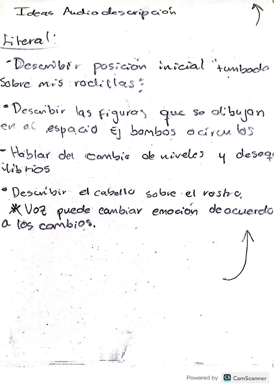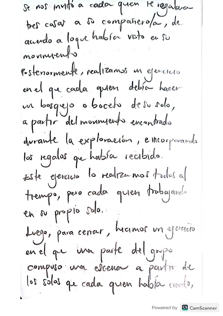 Posteriormente, realizamos un ejercicio en el que cada quien debía hacer un bosquejo o boceto de su solo, a partir del movimiento encontrado durante la exploración, e incorporando los regalos que había recibido.