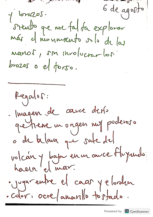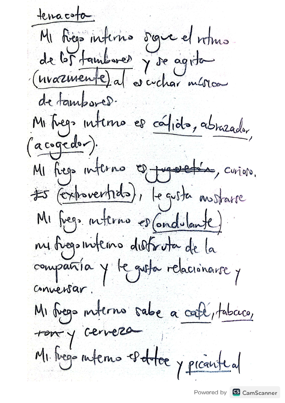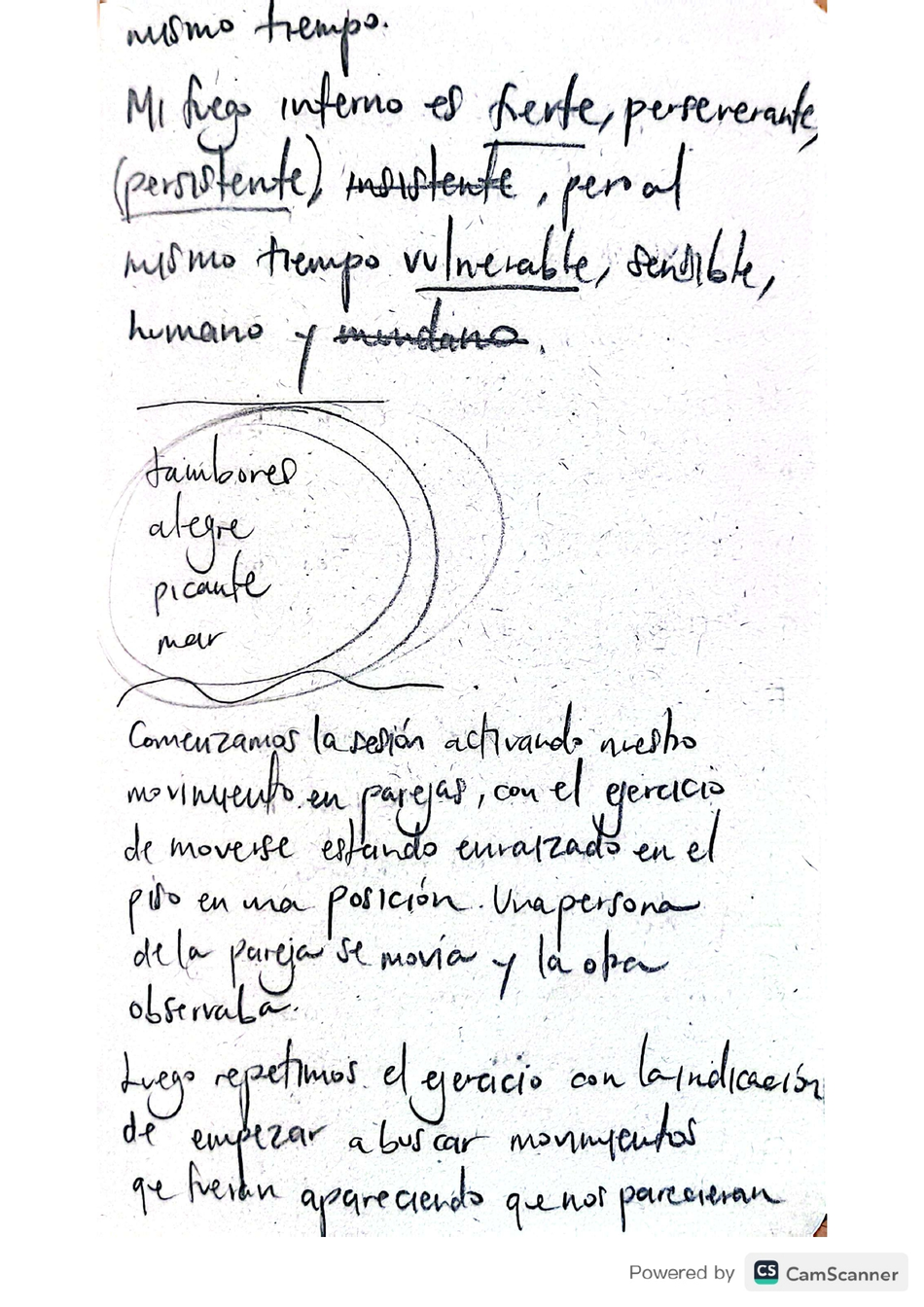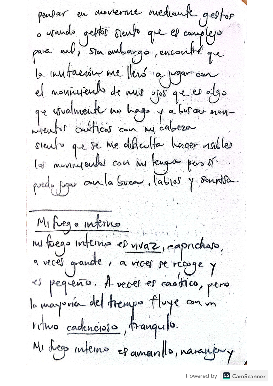 Luego hicimos un ejercicio de escritura espontánea o instantánea, en el que se nos pidió escribir lo que se nos viniera a la cabeza sobre lo que sentíamos o pensábamos que era nuestro fuego interno.