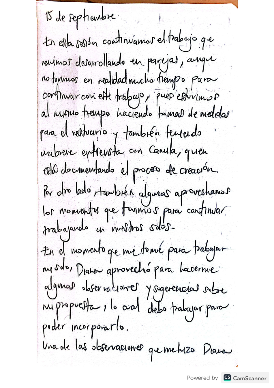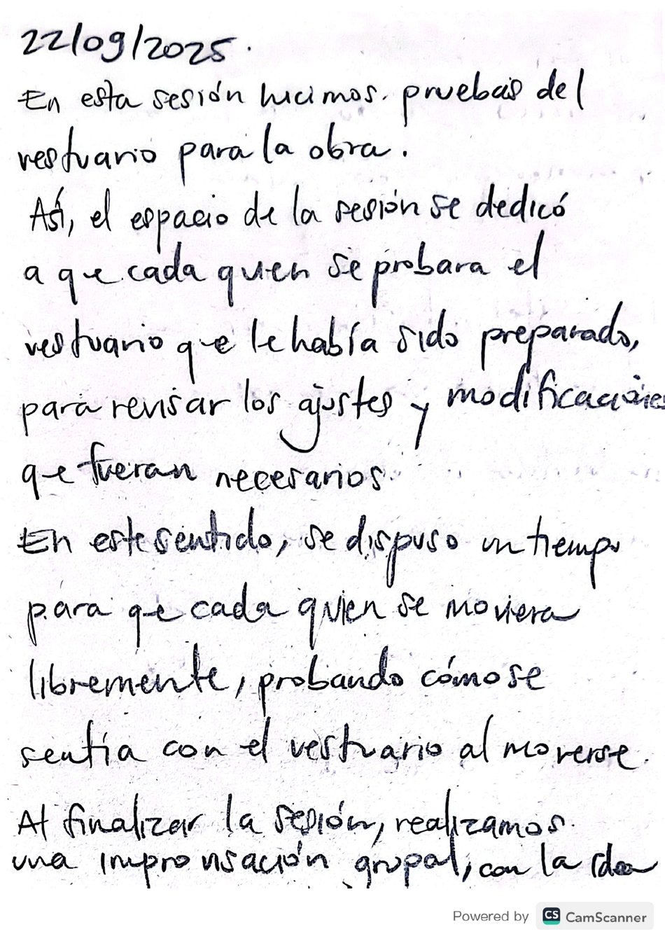En esta sesión, continuamos el trabajo que venimos desarrollando en parejas, aunque no tuvimos en realidad mucho tiempo para continuar con este trabajo, pues estuvimos al mismo tiempo haciendo tomas de medidas para el vestuario, y también teniendo una breve entrevista con Camila, quien está documentando el proceso de creación.