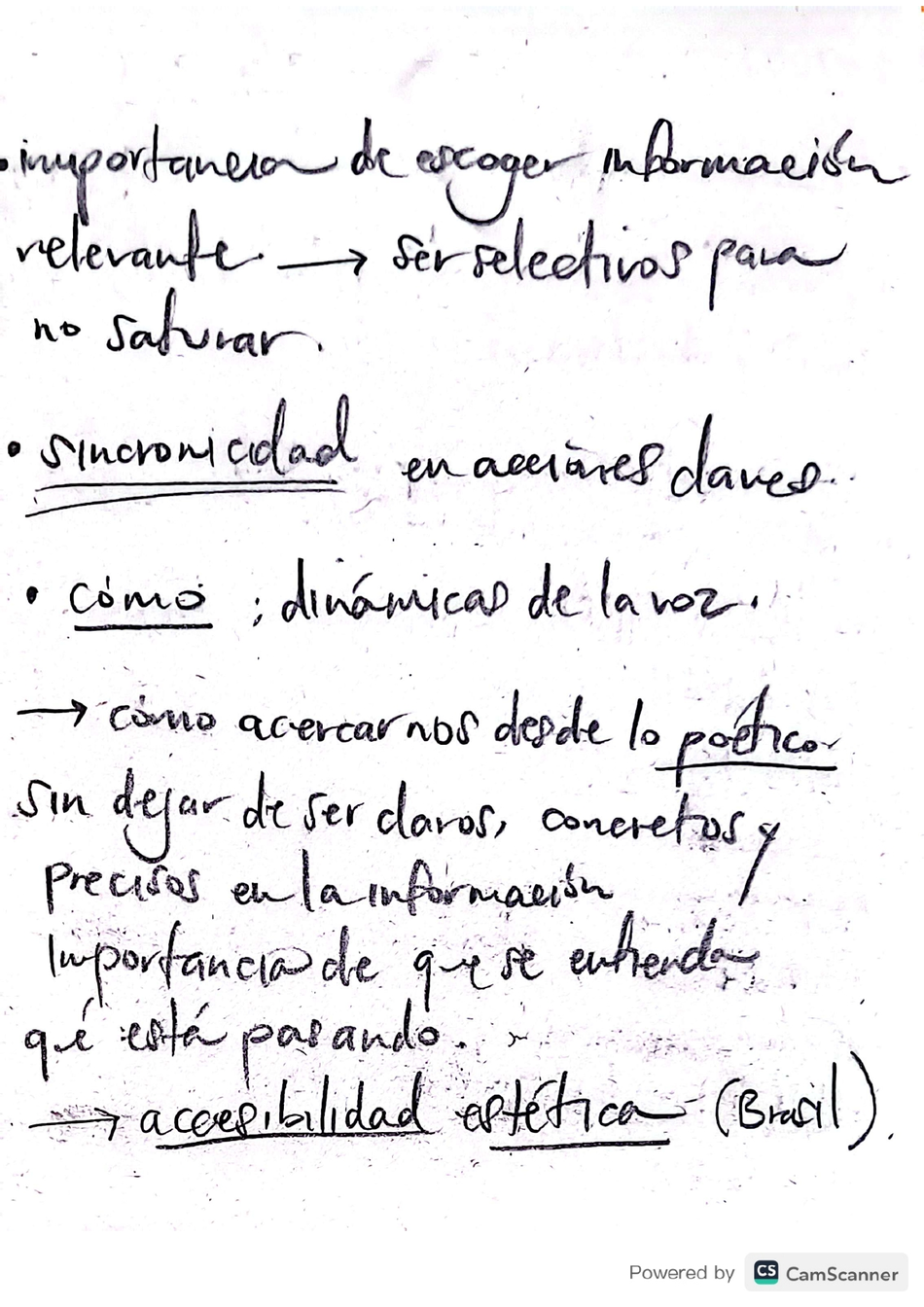 9. Es válido pensar en que la descripción sea interesante o atractiva para el público vidente, pero no se debe olvidar que este elemento está diseñado específicamente para enriquecer la experiencia de las personas ciegas o con baja visión, por lo que no se debe dejar de dar información que sea importante para que estas personas comprendan la situación.