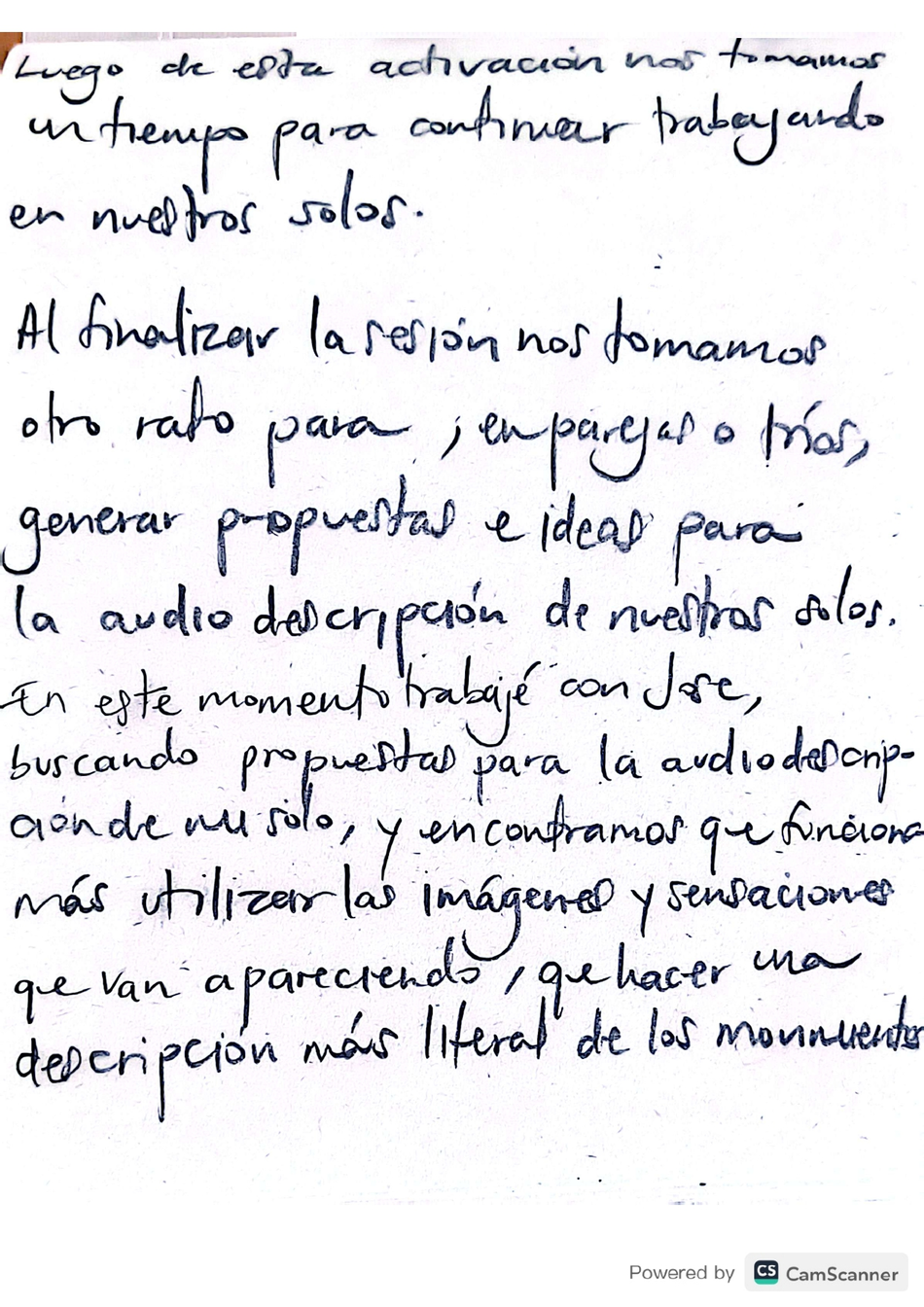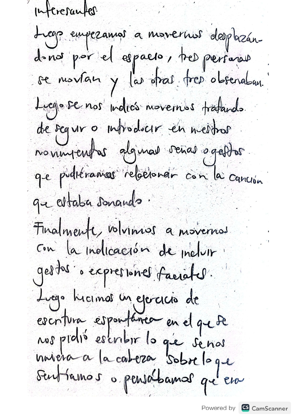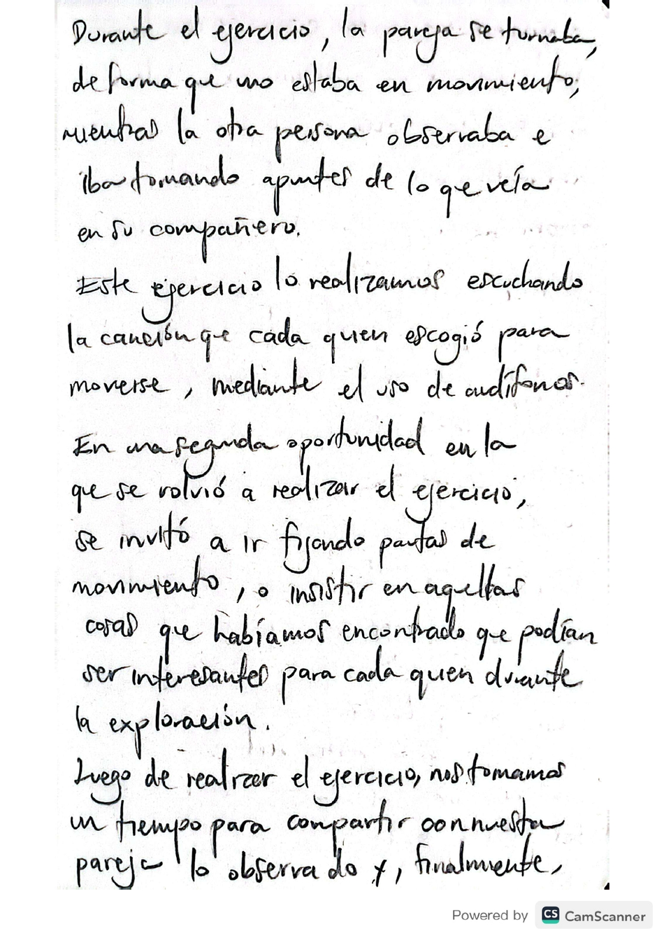 Durante el ejercicio, la pareja se turnaba, de forma que uno estaba en movimiento, mientras la otra persona observaba e iba tomando apuntes de lo que veía en su compañero. Este ejercicio lo realizamos escuchando la canción que cada quien escogió para moverse, mediante el uso de audífonos.