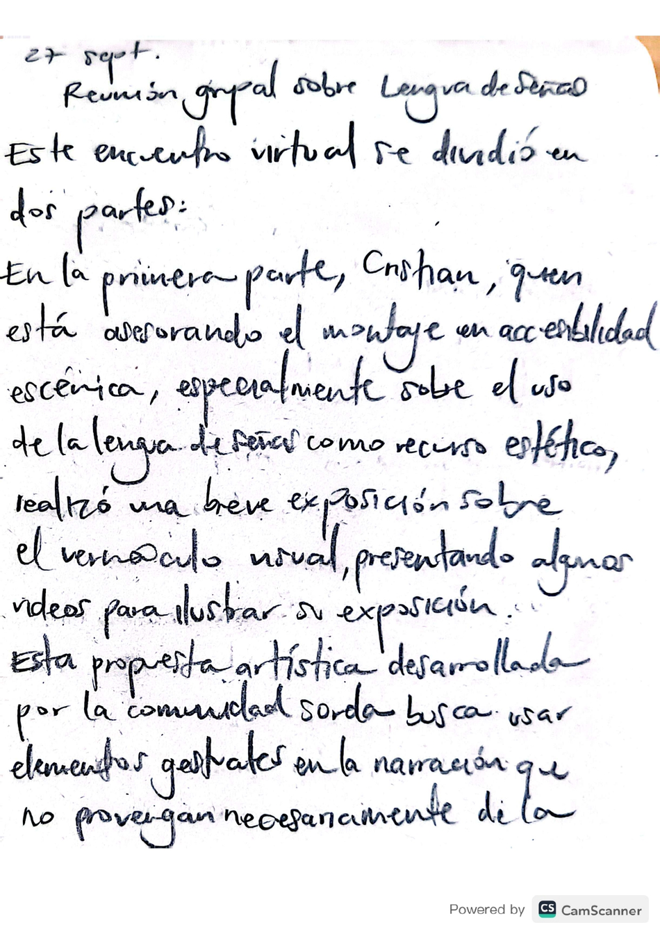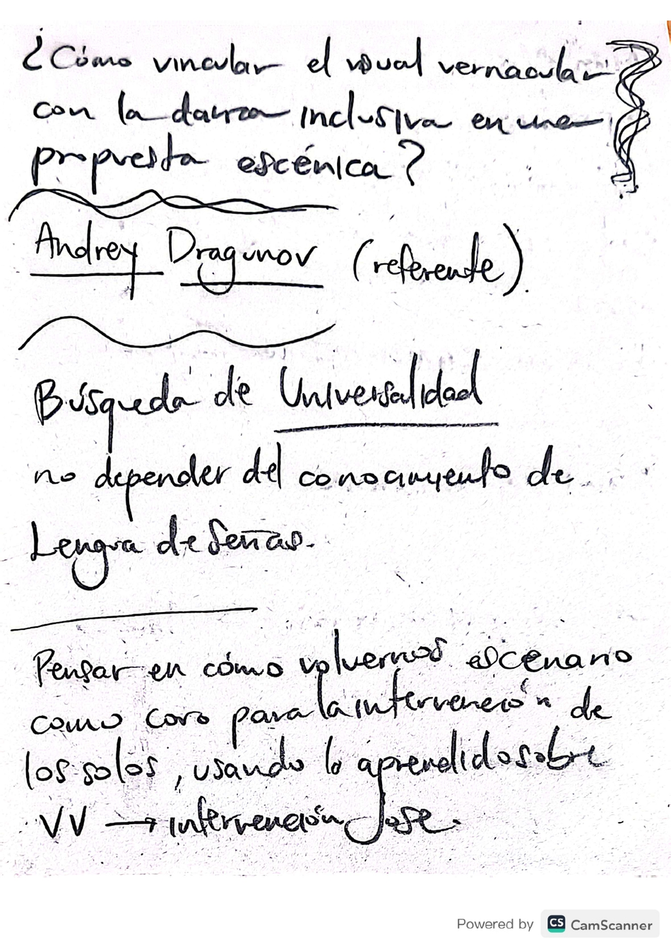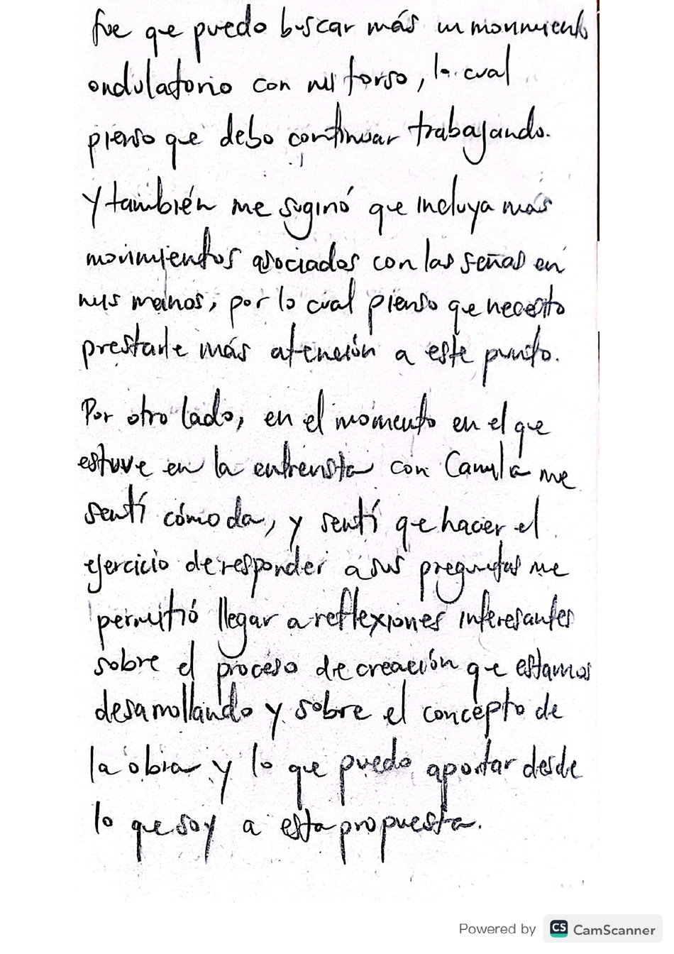 Por otro lado, en el momento en el que estuve en la entrevista con Camila, me sentí cómoda, y sentí que hacer el ejercicio de responder a sus preguntas me permitió llegar a reflexiones interesantes sobre el proceso de creación que estamos desarrollando, y sobre el concepto de la obra y lo que puedo aportar desde lo que soy a esta propuesta.