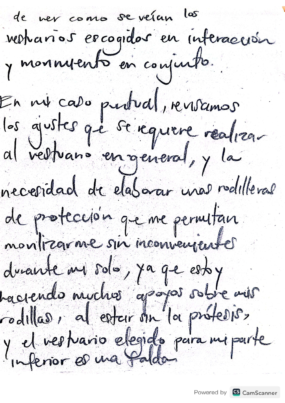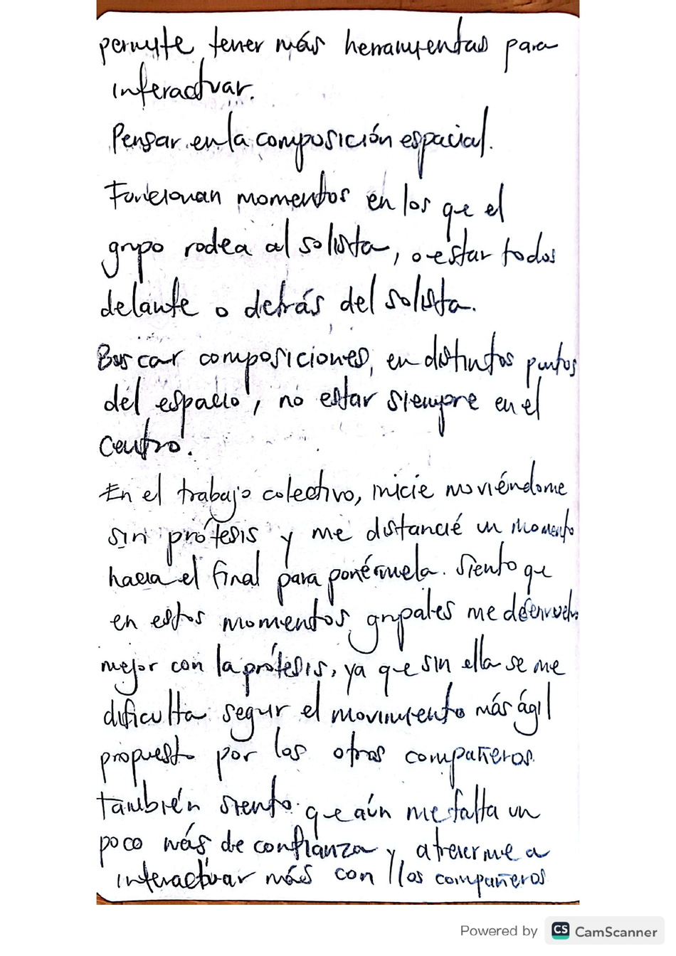 Siento que, en estos momentos grupales, me desenvuelvo mejor con la prótesis, ya que, sin ella, se me dificulta seguir el movimiento más ágil propuesto por los otros compañeros.