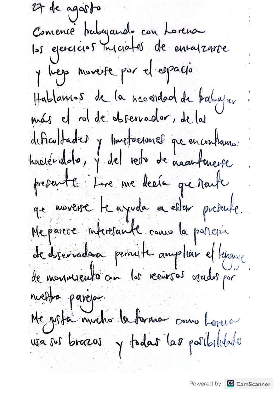 Por mi parte, me parece interesante como la posición de observadora nos permite ampliar nuestro lenguaje de movimiento con los recursos que vemos que usa nuestra pareja.