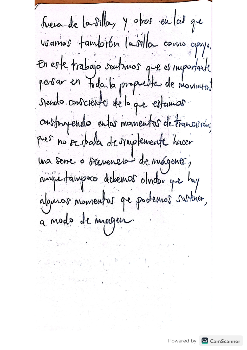 En este trabajo, sentimos que es importante pensar en toda la propuesta de movimiento, siendo conscientes de lo que estamos construyendo en los momentos de transición, pues no se trata simplemente de hacer una serie o secuencia de imágenes, aunque tampoco debemos olvidar que hay algunos momentos que podemos sostener, a modo de imagen.