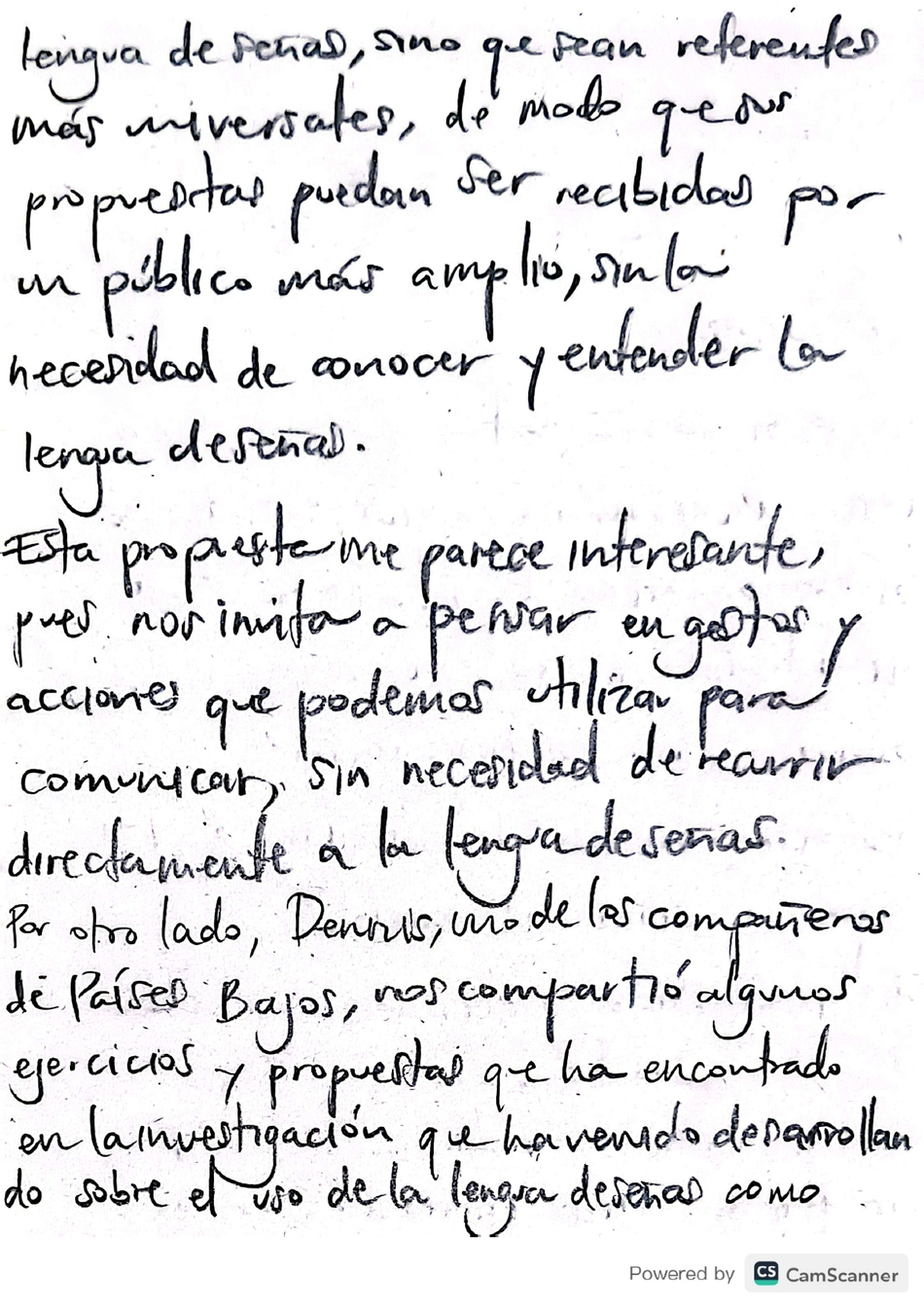 A partir del ejercicio de escritura instantánea realizado, cada participante escogió cuatro palabras que sentía que representaban su fuego interno, para aprender a interpretarlas mediante lengua de señas.