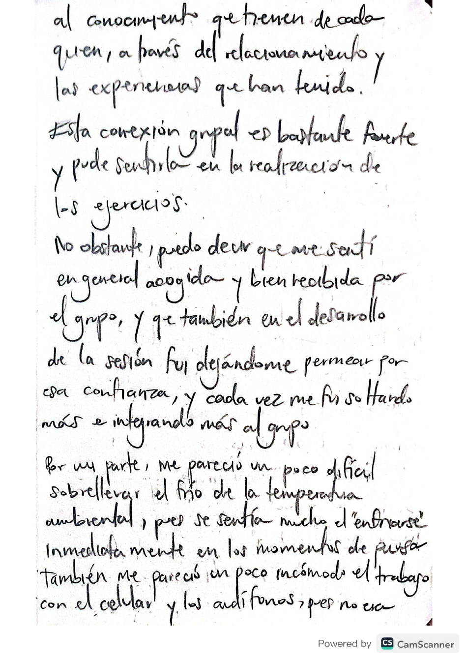 No obstante, puedo decir que me sentí en general acogida y bien recibida por el grupo, y que también en el desarrollo de la sesión fui dejándome permear por esa confianza, y cada vez me fui soltando más e integrando más al grupo.
