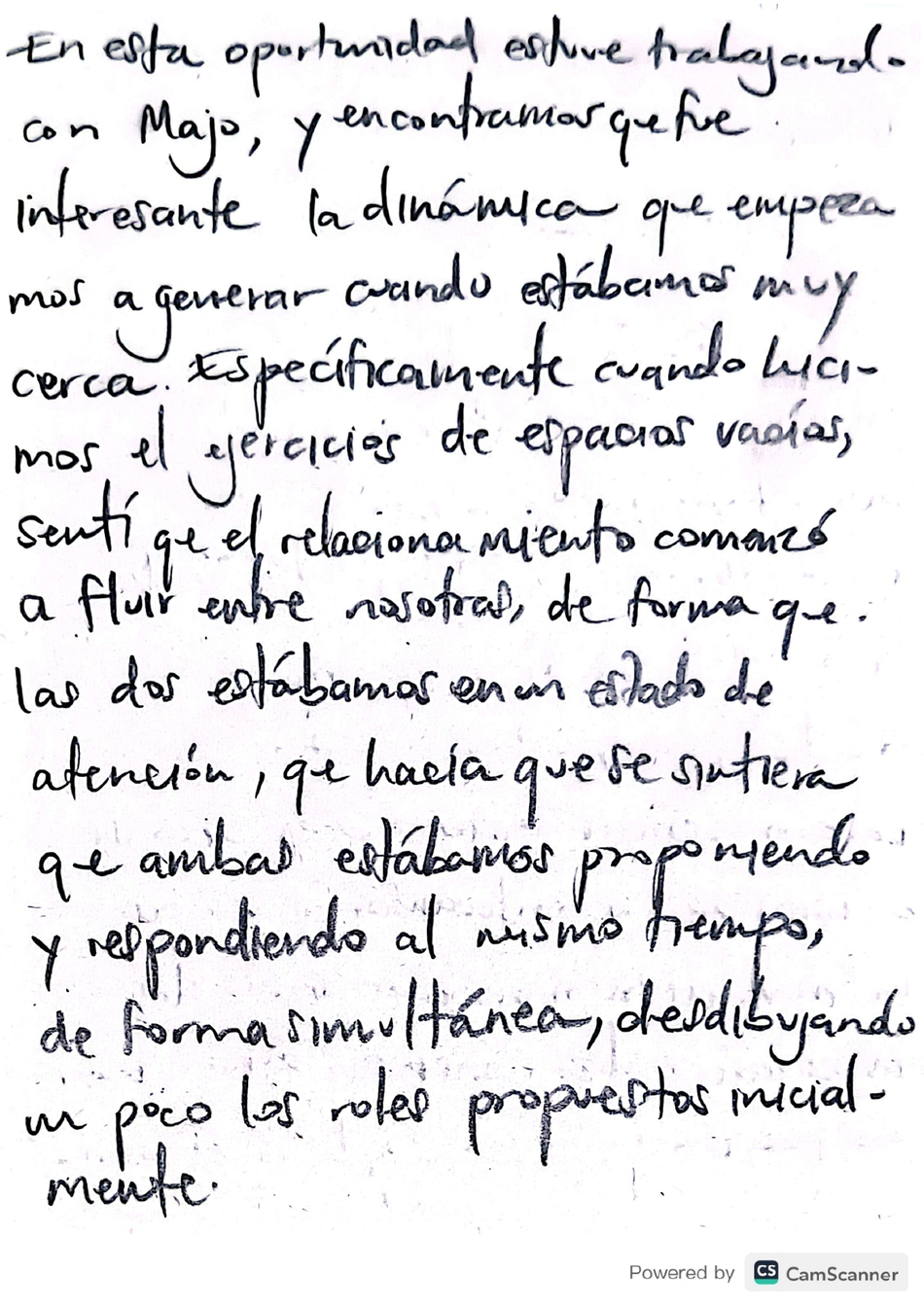 Finalmente, sentimos que hubo momentos de encaje interesantes, pero que nos faltó darnos más tiempo en estos momentos, para aprovechar mejor las situaciones que podían desarrollarse a partir de esos silencios y esa escucha.