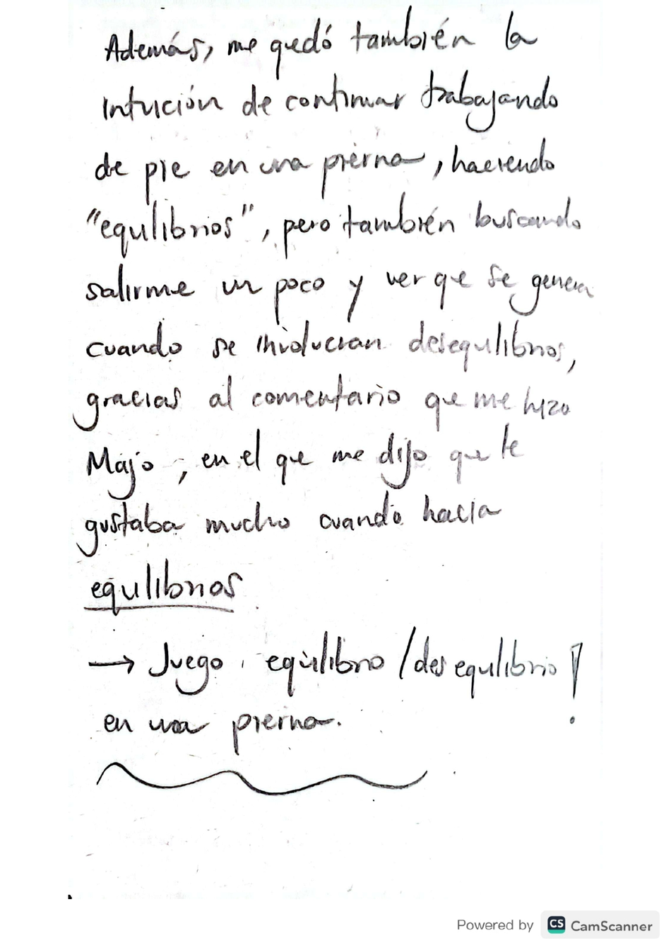 Además, me quedó también la intuición de continuar trabajando de pie en una pierna, haciendo “equilibrios”, pero también buscando salirme un poco y ver qué se genera cuando se involucran desequilibrios, gracias al comentario que me hizo Majo, en el que me dijo que le gustaba mucho cuando hacía equilibrios.