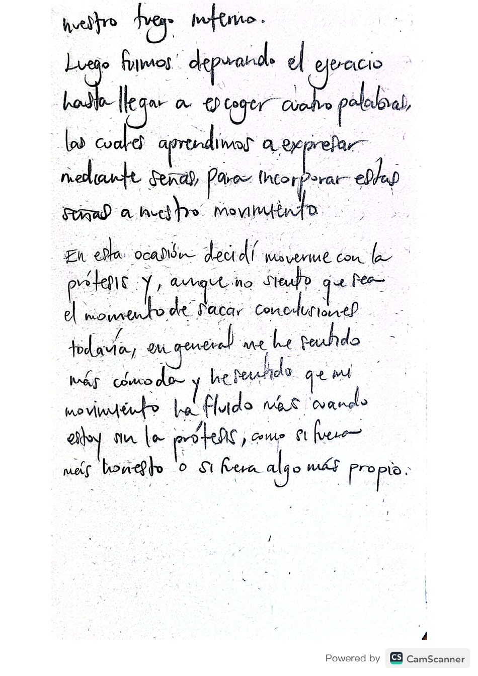 En el trabajo colectivo, inicié moviéndome sin prótesis, y me distancié un momento hacia el final para ponérmela.