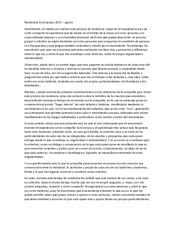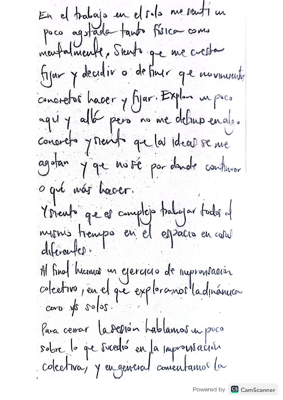 En el trabajo en el solo, me sentí un poco agotada tanto física como mentalmente. Siento que me cuesta fijar y decidir o definir qué movimientos concretos hacer y fijar. Exploro un poco aquí y allá, pero no defino algo concreto, y siento que las ideas se me agotan y que no sé por donde continuar o qué más hacer.