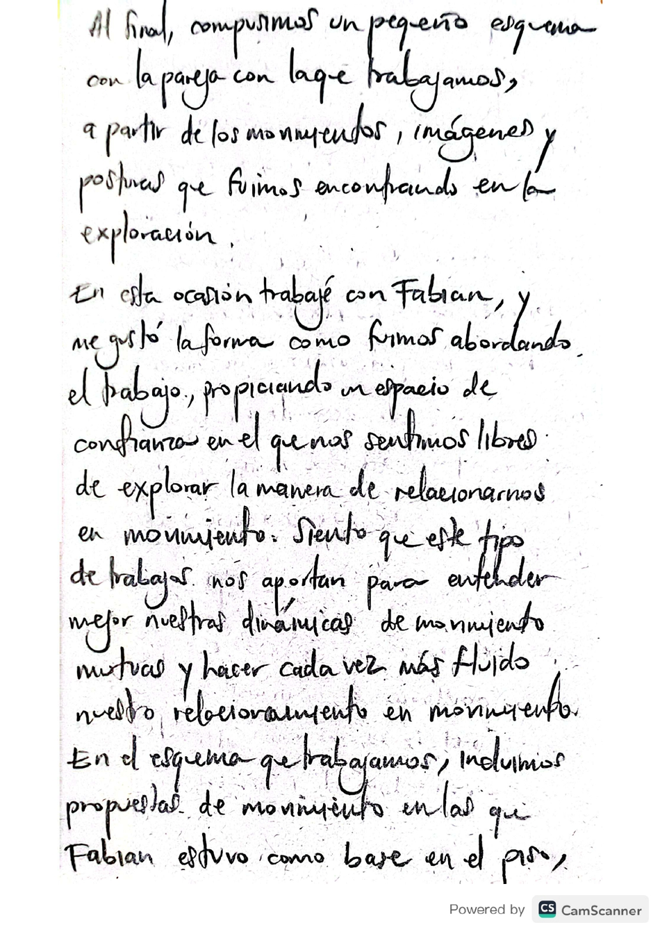 En esta ocasión trabajé con Fabian, y me gustó la forma como fuimos abordando el trabajo, propiciando un espacio de confianza en el que nos sentimos libres de explorar la manera de relacionarnos en movimiento.