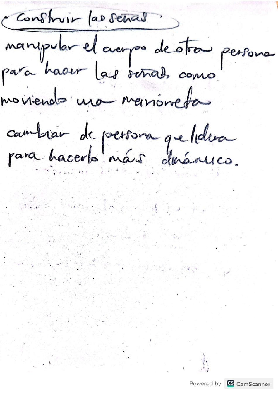 Luego fuimos depurando el ejercicio hasta llegar a escoger cuatro palabras, las cuales aprendimos a expresar mediante señas, para incorporar estas señas a nuestro movimiento.