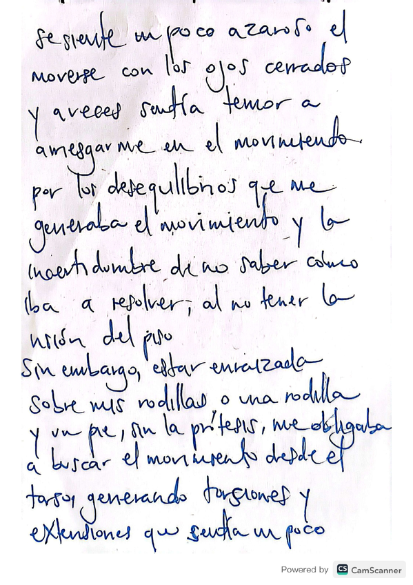 Por su parte, Lorena me dijo que le gusta la forma como me apoyo sobre la prótesis, usándola como la “aguja de un compás”, y que siente que esto me permite liberar el resto del cuerpo.