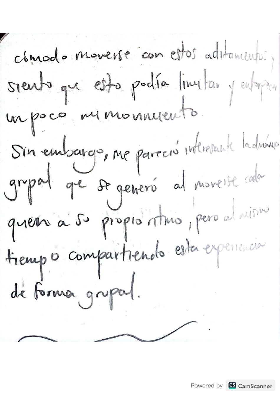 Sin embargo, me pareció interesante la dinámica grupal que se generó al moverse cada quien a su propio ritmo, pero al mismo tiempo compartiendo esta experiencia de forma grupal.