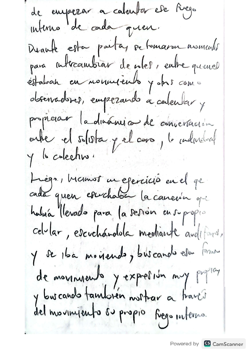 Para cerrar la sesión, hablamos un poco sobre lo que sucedió en la improvisación colectiva y, en general, comentamos sobre la necesidad de continuar trabajando en la escucha grupal y la observación, de forma que se pueda dinamizar más este papel del coro.