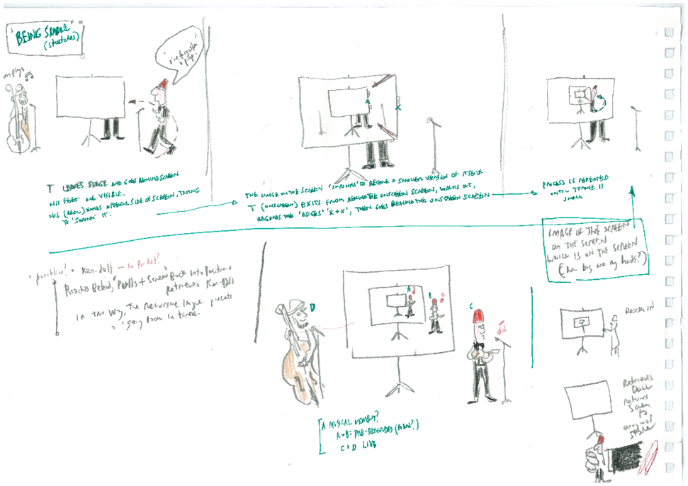 The plasticity of each art form contributed profoundly to the intermedial relationships of this piece. Surely if we’re seeking to surprise our audiences we must set up intermedial development processes so they can surprise us as artists. Highlights of both creative process and performance certainly proved the success of this dynamic. The mise en abyme sequence at the heart of the show was carefully written and thoroughly constructed, but it was not until ‘Tinyrone’ (a Ken Doll dressed as Tyrone) unexpectedly appeared above the screen, illuminated by the wandering white spotlight, that the segment took flight. This was unanticipated by script or design. Neither element was completely ‘novel’ in terms of our established conventions, yet the extremely playful manipulation of scale, screen, space and song made both artists, audiences think ‘that’s not supposed to happen’. Laughter (of the team, as well as test audiences) formed an important part of these mutations as our plans change for the better and the art forms mutually influence one another.