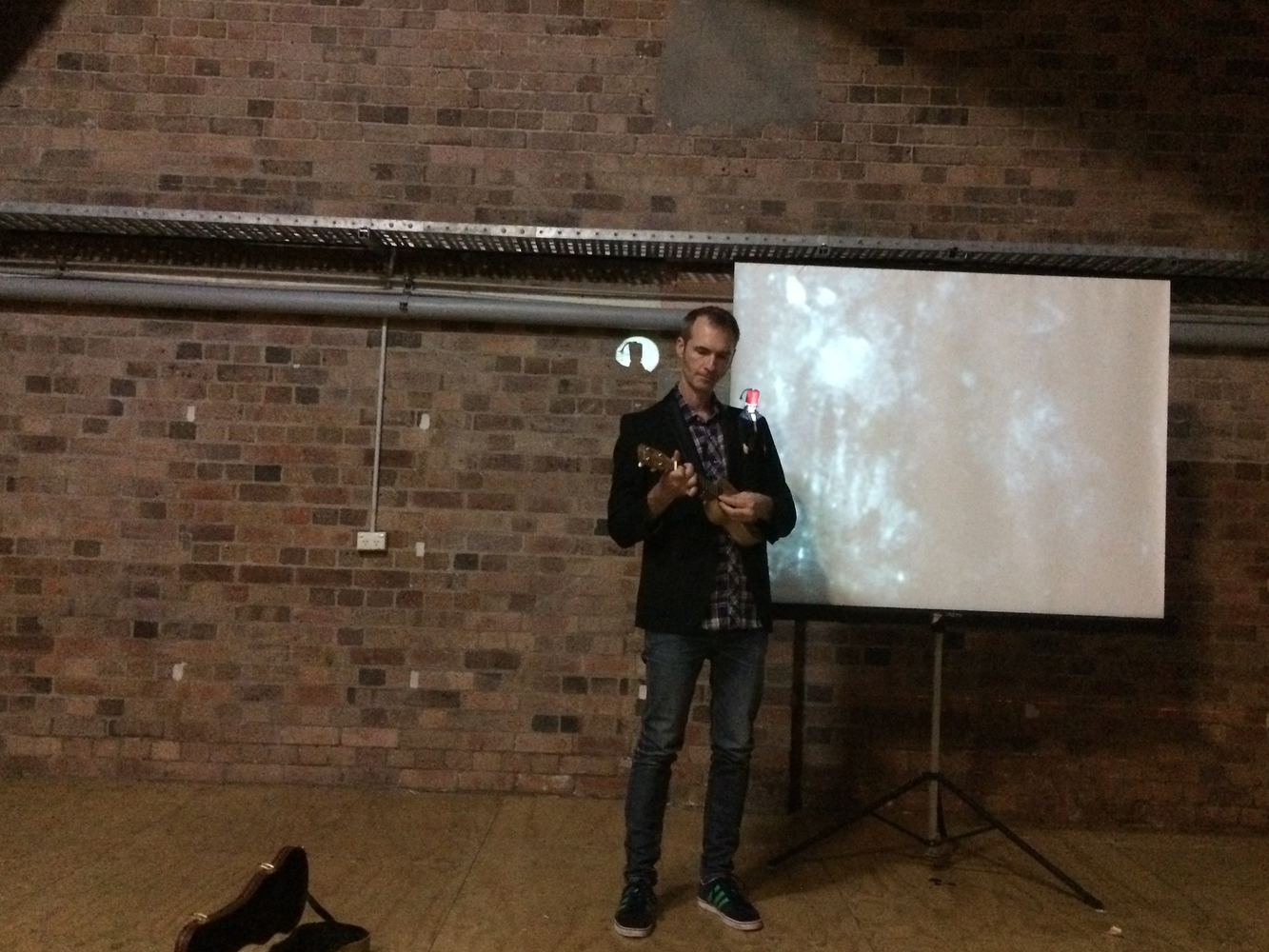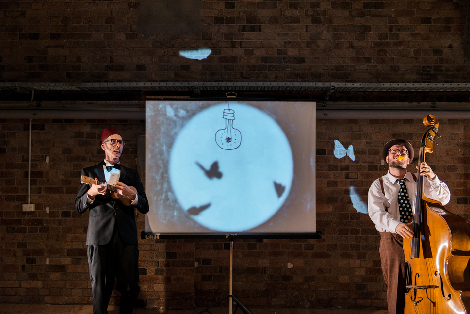 In plain language, what seems like a very simple musical presentation, accompanied by some visual elements, eventually reveals a much more complex intermedial performance, without pointing to, or advertising that complexity. In the show, Tyrone and Lesley play original songs on ukulele and double bass, alongside projected images. At a glance it might look like Post-Vaudeville. There is little backstory or exposition. The performers are clearly aware that they are employing these apparently lame production elements to enhance the quality of their regular presentation.