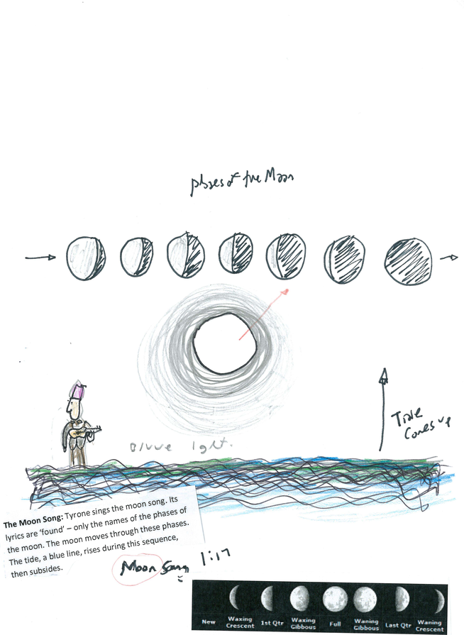 The ‘world’ of the piece was brought to us by the songs. These now intermedial fragments of an as-yet unresolved whole were treated in modes more akin to musical composition than dramatic construction. As each fragment gained shape and layers (musical, visual, performative) and the symbols of the work consolidated, we gained a growing sense that there would be a fugal flavour to the work, as images interspersed through the work reiterated, reflected upon and chased each other.