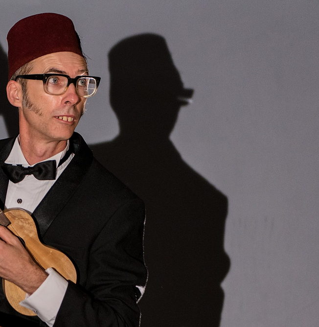 A free-standing vintage collapsible screen is the surface upon which images are projected. Some are still images, and most are animated. Some involved pre-shot live action, allowing the performers to leave the stage and apparently ‘enter the screen’. This screen’s default state is the eponymous white spot (transformable into a spotlight, moon, or the sound hole of a ukulele) on a dark background. The projections actively play with perceptions of borders and edges; that is to say, where the image appears to, and actually begins and ends.