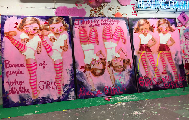 The girls of my paintings have opinions. I agree with them mostly, sometimes I just accept what they say because I want to create a dialogue. I talk about them like they would have a will of their own. With this I want to show how there is a certain amount of intuition, coincidence and learning in the artist's way of working. I use my Girl Army in my pink paintings to explore space and other limits given for a painting. The color and the girls conquer the spaces of hierarchies.