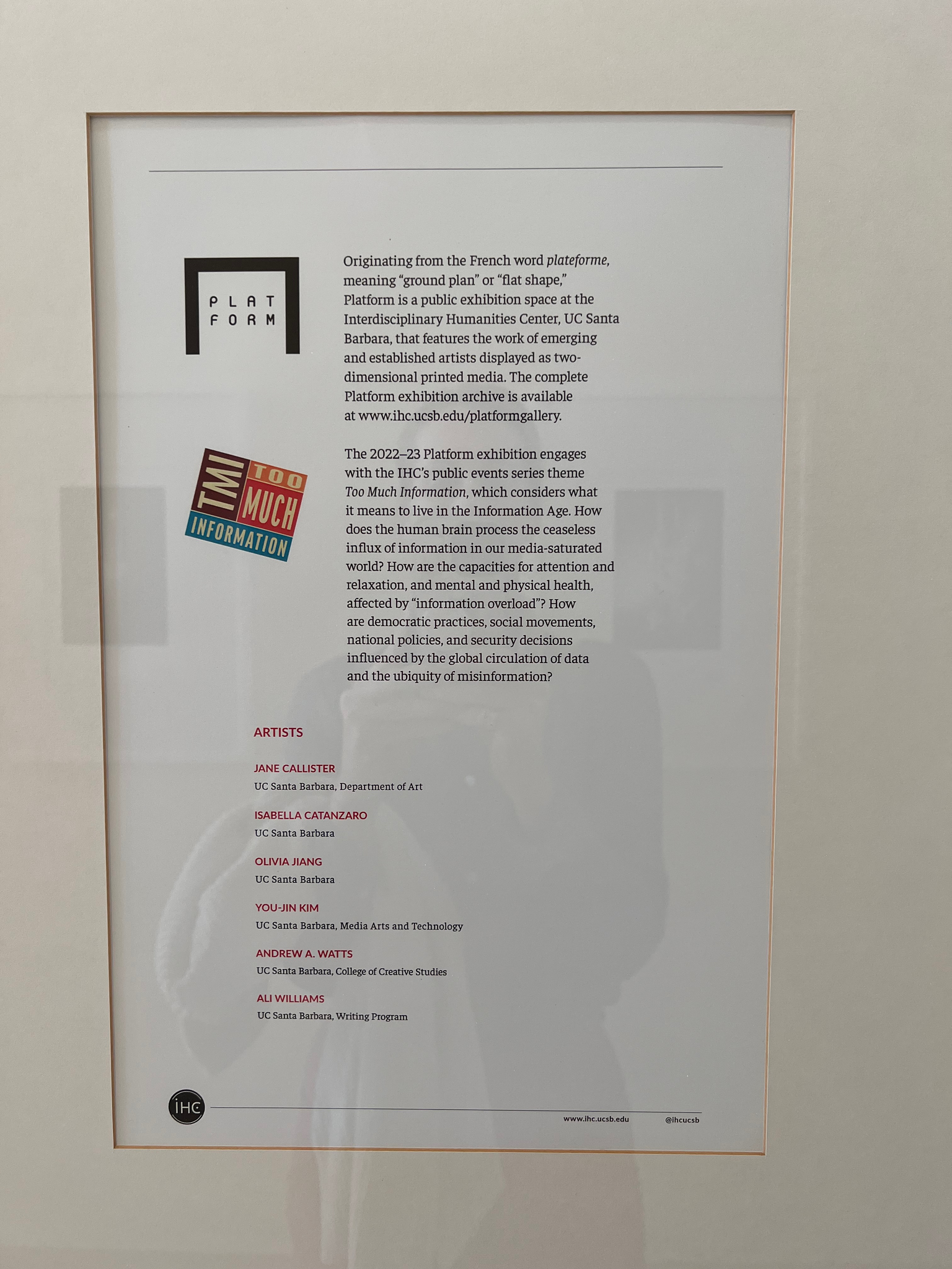 The 2022-23 Platform exhibition engages with the IHC’s public events series theme, Too Much Information, which considers what it means to live in the Information Age. How does the human brain process the ceaseless influx of information in our media-saturated world? How are the capacities for attention and relaxation, and mental and physical health, affected by “information overload”? How are democratic practices, social movements, national policies, and security decisions influenced by the global circulation of data and the ubiquity of misinformation?