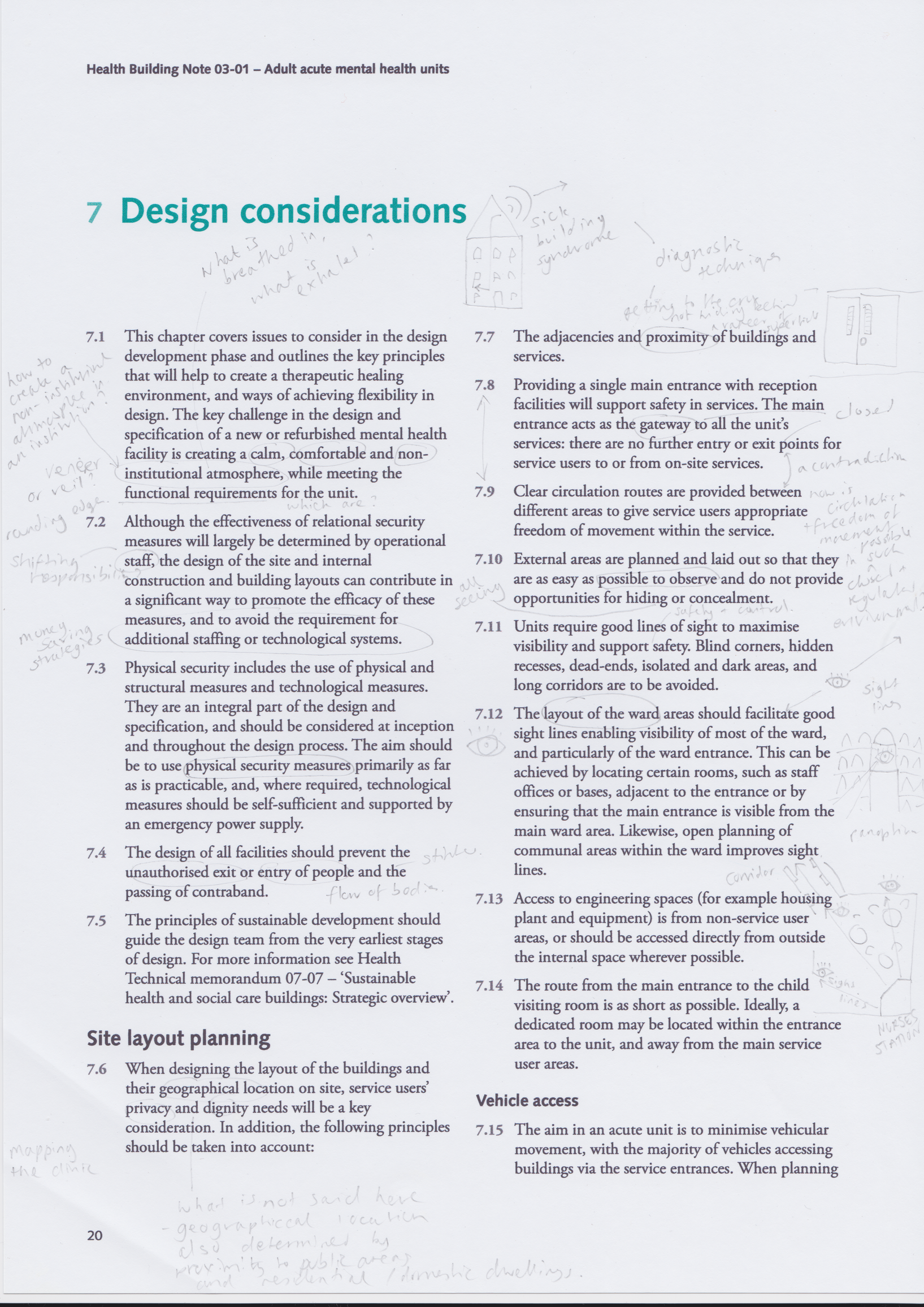 This spatial logic has a longer institutional history. Radial bedroom corridors extending from a central hub recall nineteenth-century asylum and prison architectures designed to optimise surveillance. Contemporary psychiatric wards continue to retain elements of this logic in what are described as “spoke designs,” enabling most patient doors to be “directly observed from the optimal viewing points on the wards” (Sheehan et al., 2013: 791). Risk, in this sense, is embedded not only in policy or procedure but in the geometry of the building itself. Lines become instructions: routes to follow, positions to hold, directions that render bodies readable.