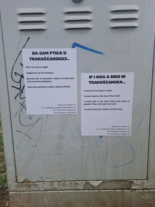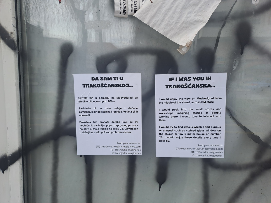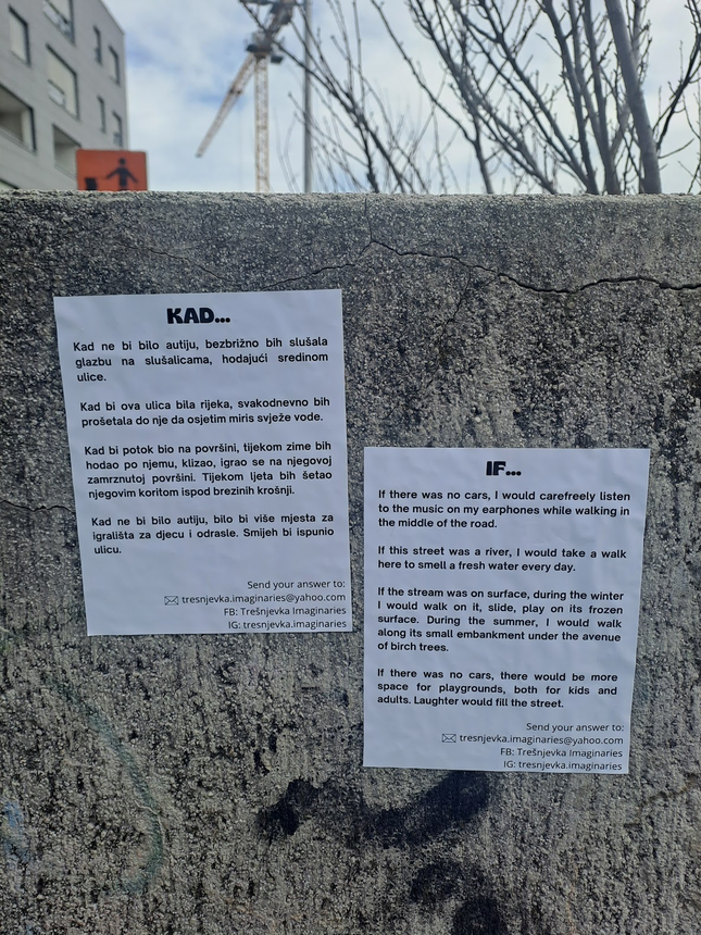 Some of the spectators watched everything from the other side of the road and then joined in the discussion and participated by leaving their answers about the changes resulting from massive constructions. Inhabitants mostly agreed that the neighborhood feels crowded and unorganized because of the huge apartment complexes and they don't feel related to those places. Some expressed the inability to influence private investors and the feeling that such actions would never stop and that we can't do anything about it. Because of that, they think that the better idea is to move away because Trešnjevka is losing the homey feeling and its warmth.