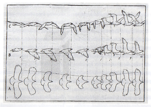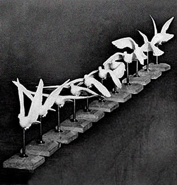 When scientist and cardiologist Étienne-Jules Marey started using photography to record his physiological experiments, he turned to Willème’s photosculpture process to simulate and, more importantly, solidify motion as a three-dimensional, sculptural animation. Fascinated by bird flight and the movement of wings, he set out in 1886–87 to record the flight of a seagull. [fig. 13] Influenced by Eadweard Muybridge, who had made synchronised photographs of the same subject from three different angles of view, Marey came up with the idea of taking synchronised photographs from the lateral, frontal, and vertical view. In order to retrieve accurate information about movement from a series of photographs, Marey built two darkened pavilions flanked by two chronophotographic cameras, with a third camera fixed to the roof facing downwards onto an area of black cloth rolled out on the ground.6 These three synchronised cameras could simultaneously capture three different angles of the same subject. Much like the contemporary 3D scanner, and reminiscent of Willème’s technique, the chronophotographs made along the X, Y, Z axis collected all the information needed to subtract a three-dimensional object from a real bird in flight. [fig. 14] ‘We have been able, using these three images, to build a series of figures in relief showing the successive positions of the bird’, Marey wrote. He created ten three-dimensional sculptures showing the various positions of a seagull during flight, separated from each other according to the real distances between each recorded position. [fig. 15] Finally, he merged the bodies of 24 birds into a single sculpture, hereby creating an exact three-dimensional figure that would correspond exactly to the physical distances between positions spaced at one fiftieth of a second intervals.7 [fig. 16] [fig. 17] In this, Marey had expanded on Willème’s photosculpture process to create a solidified volume of motion. On the one hand, he translated a photograph’s frozen moment of time and space into sculpture, and on the other, he developed new techniques that laid the foundations for cinema.