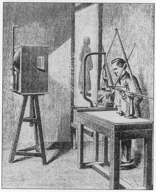 Photosculpture — which, when it began, meant simply the practice of photographing sculptures — suggested a distinctive union between photography and sculpture. This concept was advanced by the French sculptor and photographer François Willème (1830–1905). In the late 1850s, he aimed to accurately reproduce sculpture with the help of photography. Willème developed a shadowing apparatus for mapping the surface of an inanimate object. A sculpture would be placed onto a revolving turntable marked by 24 different points; at each of these points, during the objects revolution, a camera ‘successively recorded the shadows cast by the apparatus.’2 The resulting 24 photographic profiles would then be individually projected onto a screen, and each profile could then be transferred onto a three-dimensional model using a pantograph measuring device.3 The model, or prototype, was a ‘sum of profiles’ to be ‘modelled out in plaster.’4 This was done without any artistic pretence and as accurately as possible.