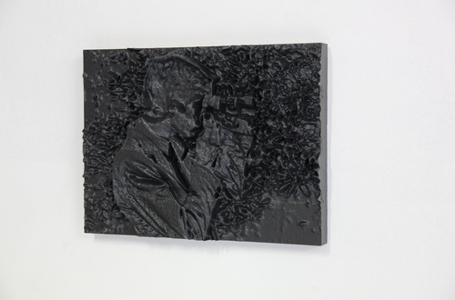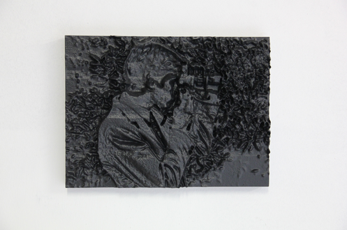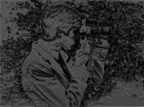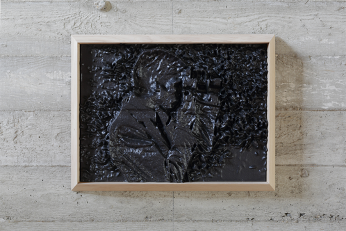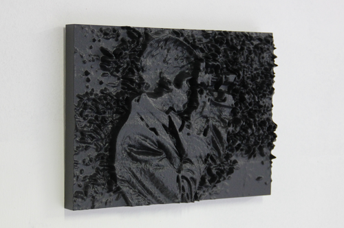 For example, my work Photographer originates from an image with strong light contrasts. [fig. 18] In its conversion from two to three dimensions, the protagonist photographer’s dark hair is pressed into the surface, while his jacket surfaces in the foreground. His black camera becomes unrecognisable due to the strong reflections of light on its surface. The leaves in the background, meanwhile, do not follow their natural shape, but peak where the light bounces back. [fig. 19] [fig. 20] The unusual results of the final, three-dimensional shape occur because the image’s translation into depth is made by its light contrast instead of its volume. Here, the software interprets entirely differently to the artist’s eye, leading to an inaccurate interpretation of reality. As an artistic experiment, the software delivered an interesting free-form map that could then be turned into an object. Progressing from this design, I had the file printed in plastic on a size of 28 x 37 x 6 cm. [fig. 21] I had the 3D print moulded and cast into bronze in order to emphasise its sculptural nature, after which it was framed in a specially designed oak frame. [fig. 22]
