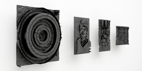 In 2014, I started working in Cinema 4D, a 3D-software program that allows the user to import a digital photograph and translate the image’s contrasts into spatial depth. The lighter areas of the photograph are read by the program as having a different level in depth as the darker areas, much like in Niépce’s tar coating. This assigned depth lends the image an abstract quality, which I found very interesting. The program accurately translated contrast into depth in a way that differed from Willème and Marey’s experiments. The software did not consider the actual proportions of the figure — as it would have when scanned — but only considered the difference between light tonalities. In other words, it produced an inaccurate figure. Its algorithm turned parts of the photograph outward or inward according to light contrasts, transforming perceived reality into a physical impossibility.