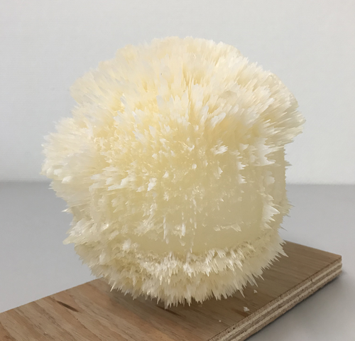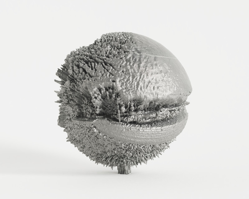 Therefore, I experimented with printing these spheres in titanium. Titanium printers are the most precise printers available and are able to build up complex self-supporting forms. The natural appearance of the printable alloy provided the necessary strength and weight. The original panorama photograph contained a landscape with a road and a flat field with overhanging trees on one side; on the other side was a clearly identifiable tree on the distant horizon. It was an interesting panorama, since it offered such a heterogeneous composition of different landscapes in one image. [fig. 38] When it became an object, it rendered the photographed landscape nearly unrecognizable. Fluffy clouds became mountain ridges on a sea of sky, the horizon an abyss, the nearby forest an almost unprintable frenzy of deep lines. A rare identifiable feature in this experiment was a naked poplar tree from the foreground. The result, 51°00'15.4"N x 5°24'01.3"E, was a photograph that has been converted from two to three dimensions. It is a 360 x 180-degree panoramic photograph of a landscape that has been translated into depth. The landscape is seemingly carved into the surface, varying in depth according to their brightness in the original image. This image-as-sculptural-form, which gleans its title from the photograph’s geographic coordinates, carries the idea of photo-sculptures to an extreme conclusion. Once translated and materialised, these titanium orbs looked like little stars. Like a sun shaped by its own light. The outcome is a solidified photograph of landscape and memory. [fig. 39]