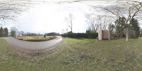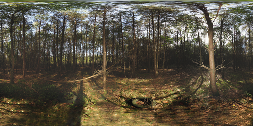 In my own research, I wanted a greater degree of abstraction than the rectangular frame of a photograph could offer. The different perspectives from the camera obscura, the panorama pavilion, the Géorama, the Cinéorama, and the sketches of James Nasmyth offered more interesting possibilities. I started photographing panoramic landscapes in the round. These digital panoramic photographs were taken with an 8mm wide-angle camera and a special tripod equipped with a Nodal Ninja, which allows 360-degree pivoting without horizontal discrepancies. With six photographs recorded — four in the round, one from the sky, and one from the ground — a full photosphere of 360 x 180 degrees can be stitched together in one equirectangular panorama, using a software program such as PTGui.
