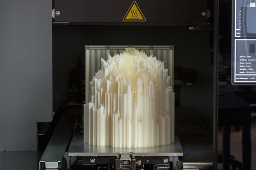 The next step was printing these image files into objects. I printed an example in plastic, 20 cm in diameter, with a high-end 3D printer. It was based on a photograph of a forest, with a vantage point located between the trees. [fig. 36] The panoramic photograph of the dense forest became an object shaped like a star, the treetops turned into a wild landscape of spikes. [fig. 37] It was, however, so detailed and fragile, that a cast in bronze proved impossible. And plastic as an end result was not desirable, for the same reason as Photographer was cast in bronze — to emphasise its sculptural nature and to give the object both a physical and psychological weight in its perception.