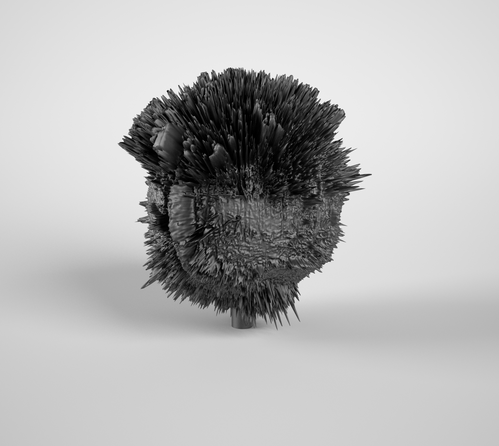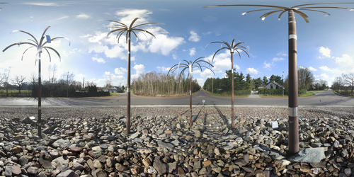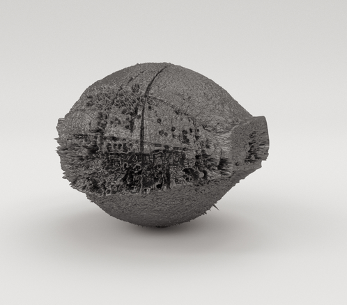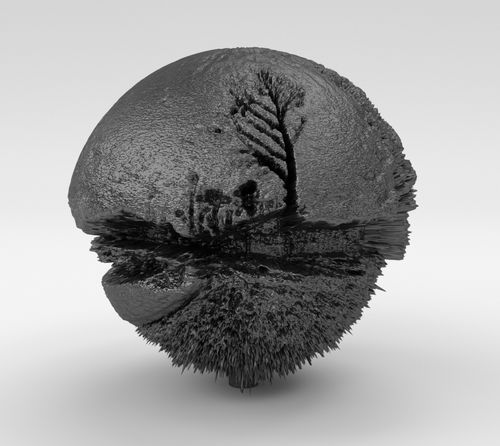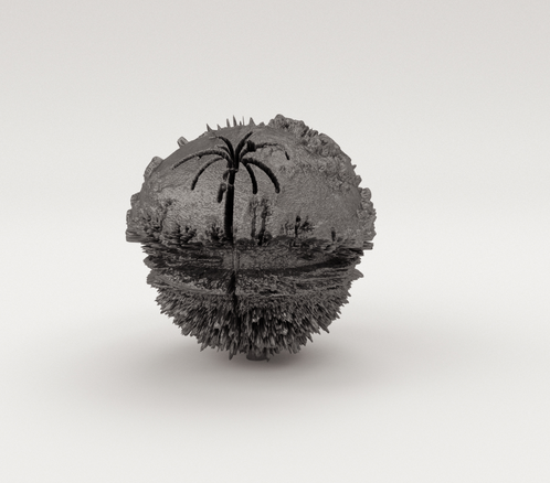 Proceeding from this point onwards, I applied to the photosphere the same logarithm in Cinema 4D, translating the light contrasts into depth. This gave an entirely different form when rendered: the skeleton of a tarpaper shack, with its clear lines intersecting rocky foregrounds. [fig. 33] An abandoned train tunnel as an elliptical form. [fig. 34] A roundabout with a public sculpture featuring five rusty palm trees becomes entirely abstract, except for the palm trees. [fig. 35] All these places photographed held special meaning and memories connected to my family history, but they were also intended to influence the eventual shape of the sphere’s relief. The beams of the tarpaper shack drew strong lines in the eventual object. The train tunnel became a dark, covered space with bright light at both ends. The roundabout’s palm trees translated beautifully, carved deeply and clearly into the object, while the circular form of the roundabout corresponded perfectly with the circles of the sphere.