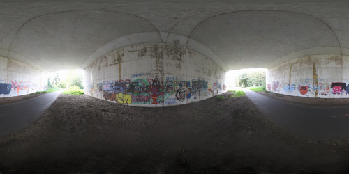 | fig. 34 | 360° x 180° photosphere of a train tunnel in the village and digital render of its 3D conversion |