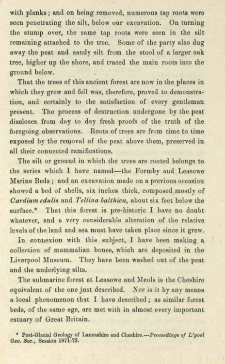 On a quiet unused part of the foreshore, close to Hightown and the mouth of the River Alt, is another submerged forest. This submerged forest has been known about since it was uncovered by the sea in the 1870s. It has had quite a bit of research done on it with species analysis carried out on the exposed trees in the same decade it was uncovered. A PhD student in the 90s did some further paeolo-environmental analysis on the site. He identified the dominant species present as being birch, with smaller amounts of oak, alder and willow also present. It has been suggested that, like Cleethorpes the woodland was unlikely to have been managed and only likely used as a wild food resource.