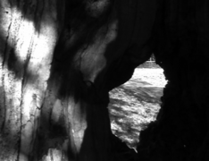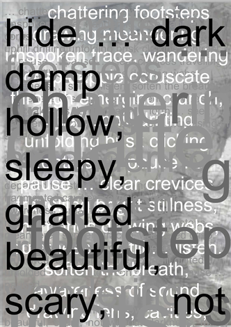 hide … dark damp hollow, sleepy, gnarled beautiful, scary, not without darkness, musty crawling scaly bark, scarred, twisted and impaled, childhood screaming, magical rasping round and round, scampering thudding, hearts pounding … silence … silence … glimpse, pause for the self, breath flowing noisily rushing … and … flickering through … peep … moist mossy dry biting timber crunching ear to shaft, rough splintering squidgy sap, childhood memories faraway grown from a seed, carving longevity through the stages of life, manifestation of time inspiring awe fear veil aging under the cover of darkness cast upon the ground … seek
