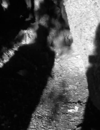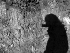 The previous two drawings, drawing with discussion and drawing with memory [2], formed a part of the collective memories of tree influencing the approach to drawing with discussion and memory. During the process of drawing through moving image there emerged the potential to re-experience childhood memories of hide and seek through the new collective encounter. The camera drew footsteps increasing and decreasing in speed and intensity (Still 5) [7], approaching dark hollows and leaving damp recess (Still 7 & 8) [9] [10]. The hums drew with moving image the differing viewpoints passing between the seeker (Still 8) [10] and the hider drawing a period of stillness as the hider [the camera], waiting to be found, recorded the sounds of the tree with quietness from those present.