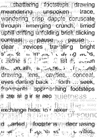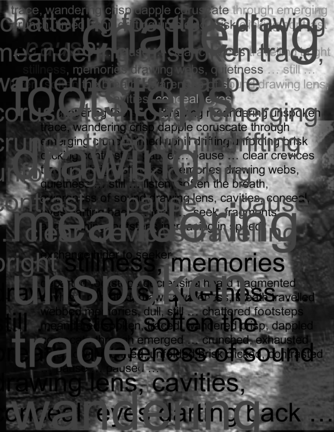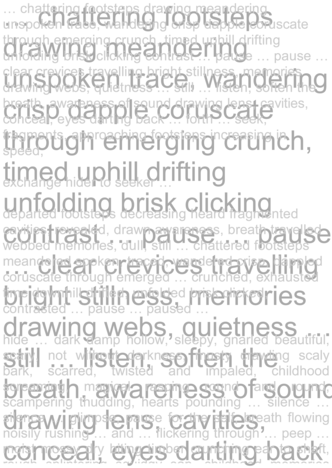 departed footsteps decreasing heard fragmented cavities, revealed, drawn awareness, breath travelled webbed memories, dull, still … chattered footsteps meandered spoken, traced, wandered crisp, dappled coruscate through emerged … crunched, exhausted time downhill drifted, unfolded brisk clicked, contrasted … pause … paused …