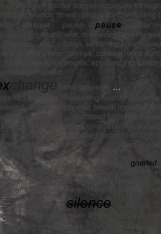 Drawing with discussion 2 [11] was created from the collective experience of tree during drawing with discussion and memory, and was considered to include (in the equivalence of mark) the senses of sight (dapple, coruscate, contrast etc.), sound (crunched, listen, quietness etc.) and touch (fragments, webs, cavities). The hums reflected that the sense of smell could be implied in the imagery conjured up by the marks (text) associated with the senses of sight, sound and touch, as these were experienced alongside the sense of smell. However, the senses of smell and taste were not considered to be directly present in drawing with discussion 2.