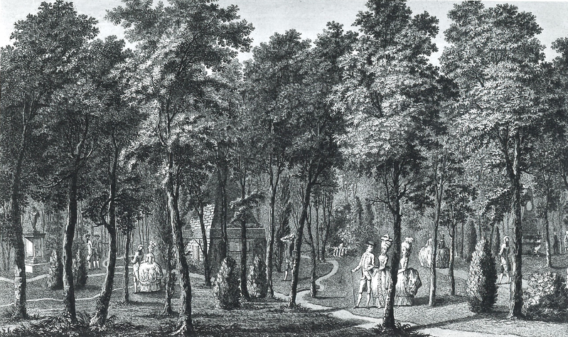 Figure 8. L. Lesueur after Louis Carrogis de Carmontelle, Vue du bois des Tombeaux, prise de point L., 1779, engraving on paper. In Jardin de Monceau, près de Paris, appartenant à son altesse sérénissime monseigneur le duc de Chartres (Paris: Delafosse, Née & Masquelier). Source: gallica.bnf.fr / Bibliothèque nationale de France.