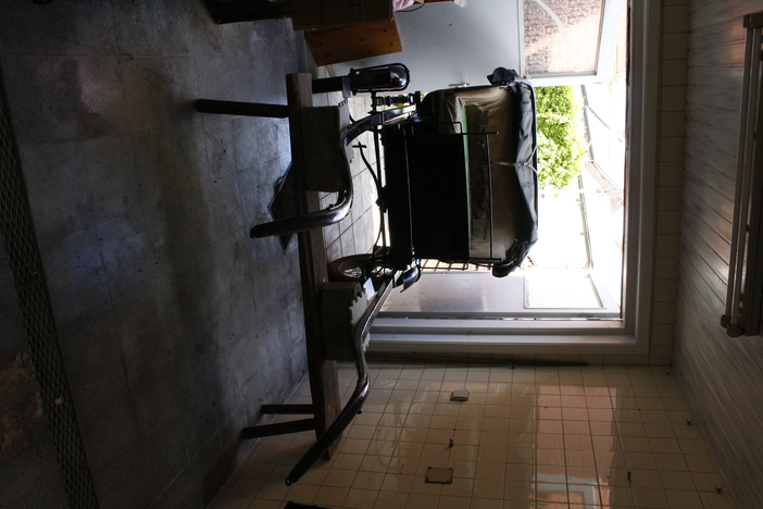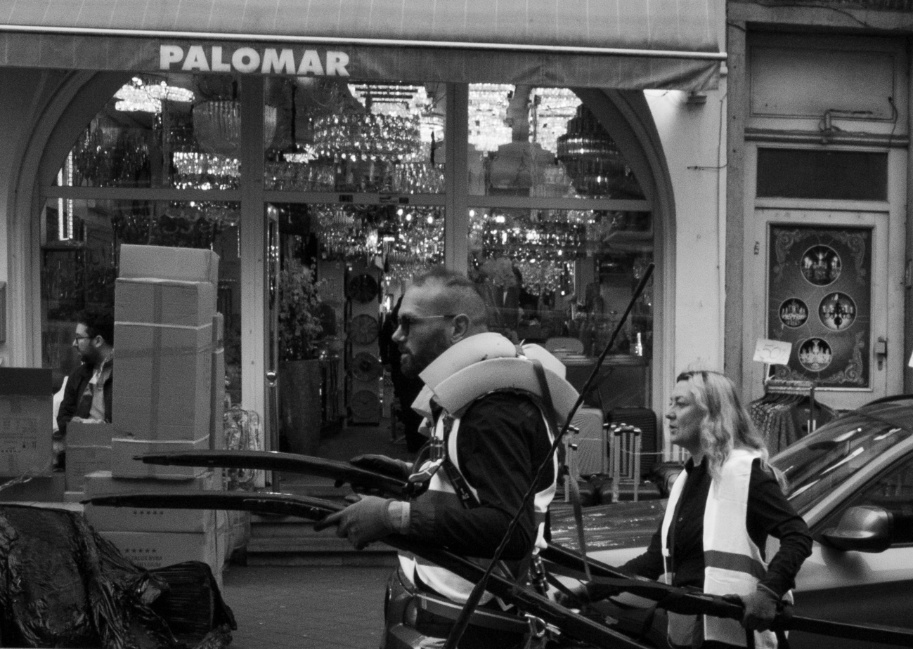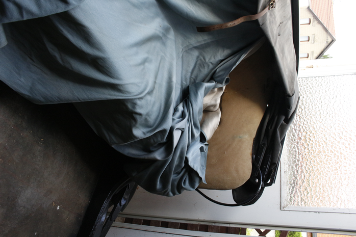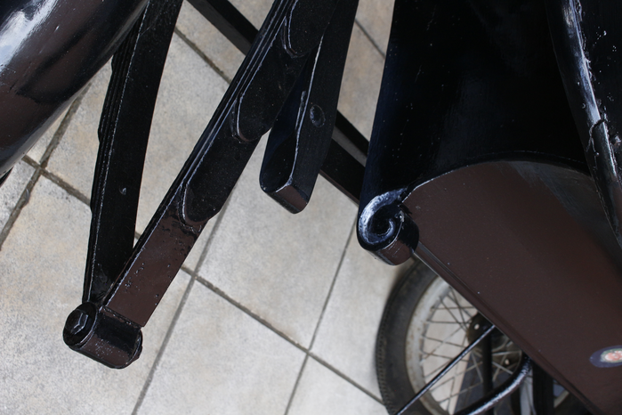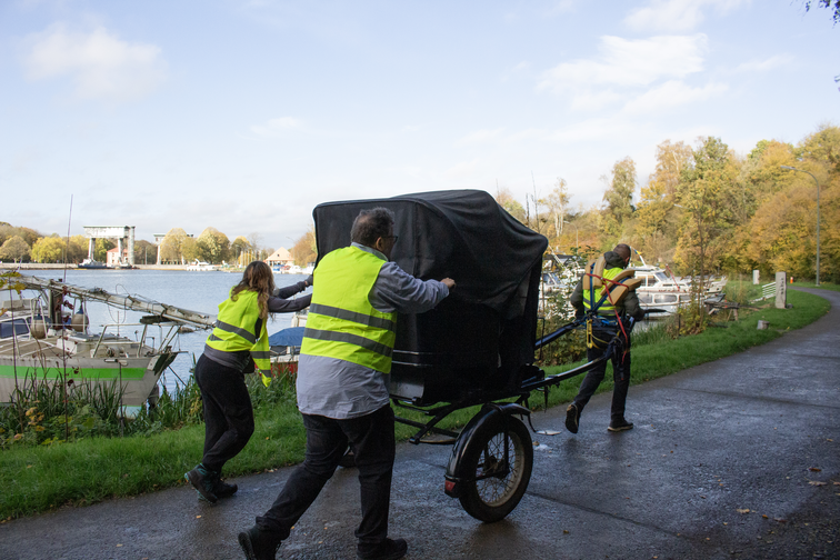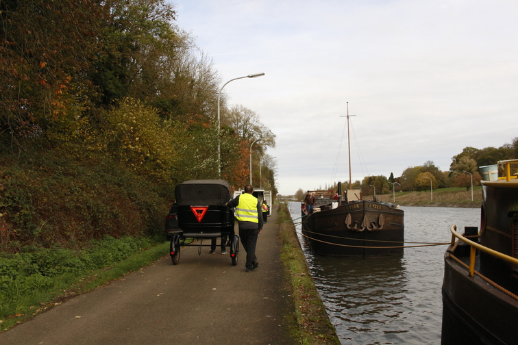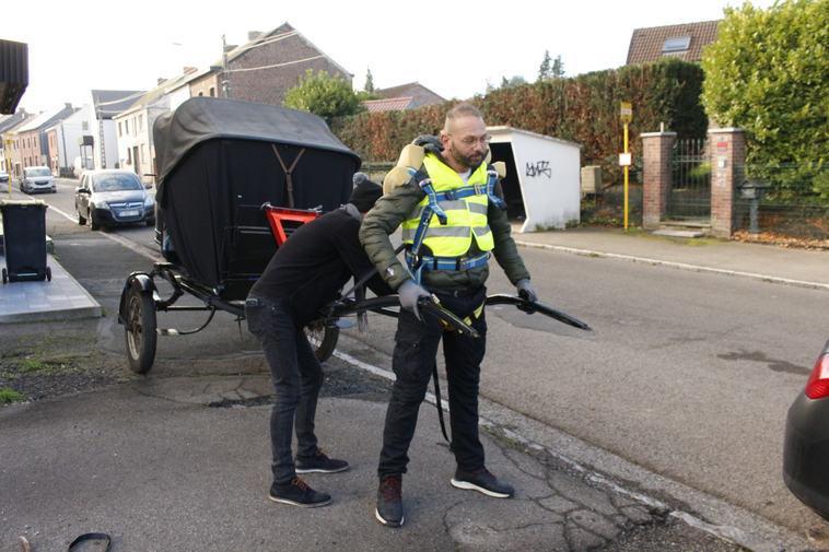 The carriage was braced by a steel chassis, its body part-wood, part-metal, conveyed on rubber tyres rather than the wooden carriage wheels of the picturesque. The calèche, made in Enghien, Belgium, around the time of the Second World War, and in use by 1947 (see Figure 15), had later been dismantled and stored in a barn in Wallonia for decades, then reassembled and restored in the 1970s. The carriage, resting on two wheels, required a third resting point, its mass triangulated on the shoulders of the carriage puller.