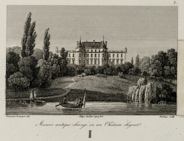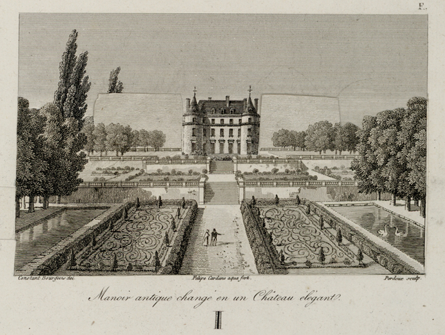 Figure 12. Felipe Cardano after Constant Bourgeois, Manoir antique changé en un Château Elegant, 1808 (flap closed), Bibliothèque de l’Institut National d’Histoire de l’Art, Collection Jacques Doucet. With the flap closed, Bourgeois’ design, engraved by Cardano, depicts the landscape prior to Hubert Robert’s picturesque landscape intervention.