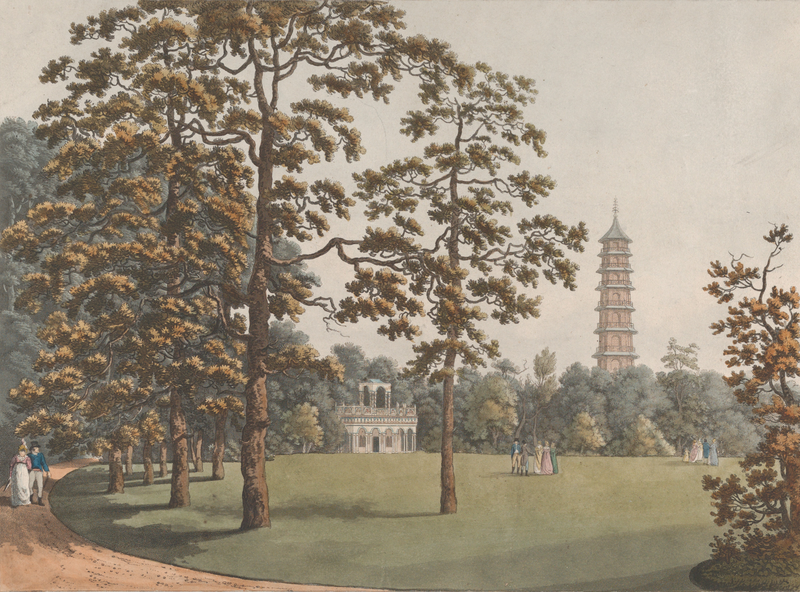 Figure 11. Heinrich Joseph Schütz after Franz Joseph Mannskirsch, A View in Kew Gardens of the Alhambra & Pagoda, 1798, aquatint with watercolour, Metropolitan Museum of Art, New York. The Elisha Whittelsey Collection, The Elisha Whittelsey Fund, 1963. William Chambers’ architectural constructions at Kew Gardens conceived of a simultaneous space-time wherein an Alhambra, Chinese pagoda, and Turkish mosque (not pictured) could exist side by side along the picturesque landscape traverse. This garden of all times and all places is evidenced by Patrick Eyres to be a representation of the British Empire’s expansionist crusade (2013: 125).